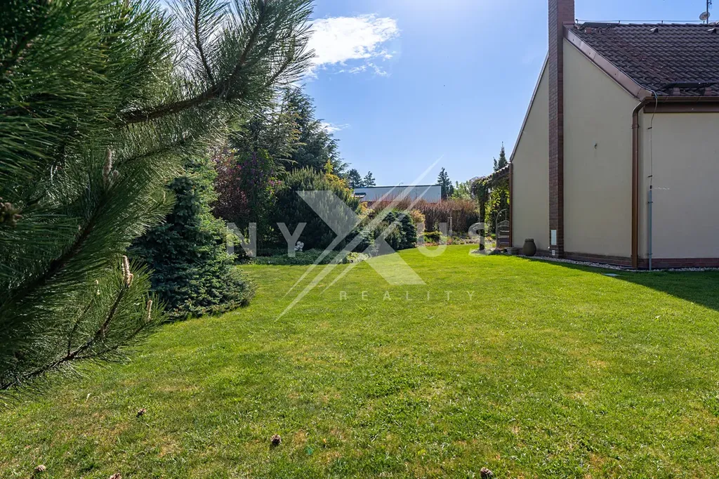 Elegantní dvoupodlažní dům v anglickém stylu stojí uprostřed rovné zahrady se vzrostlými stromy a keři, nechybí ani různé druhy těch ovocných. Pěstěný trávník udržuje automatická závlaha, zahradní technika je uskladněna v samostatném zahradním domku. Velký pozemek nabízí mnoho dalších využití, jako je například vybudování zimní zahrady, sauny, bazénu či rozšíření domu.