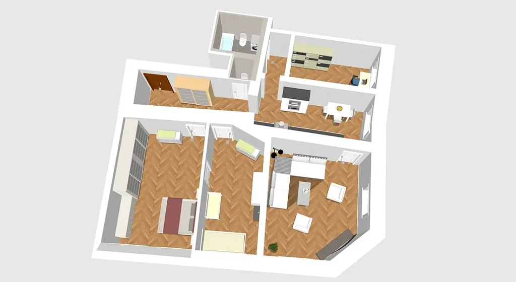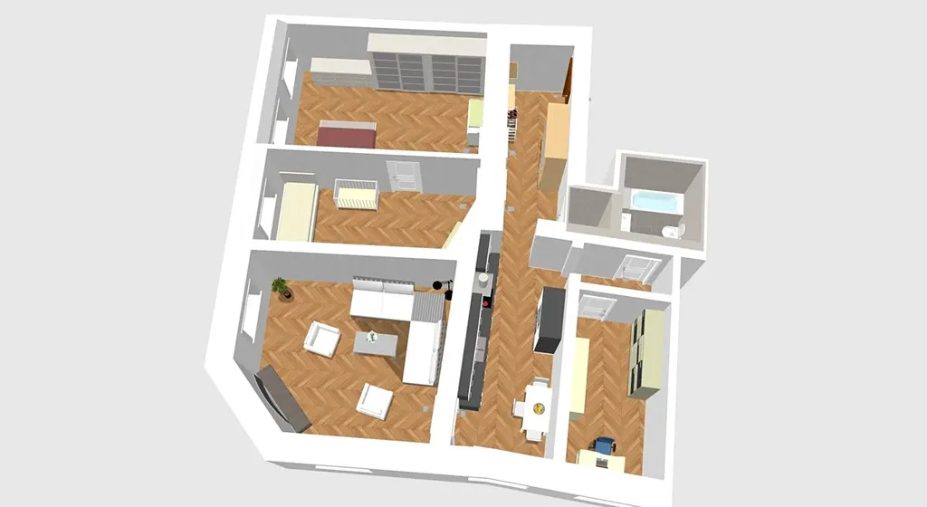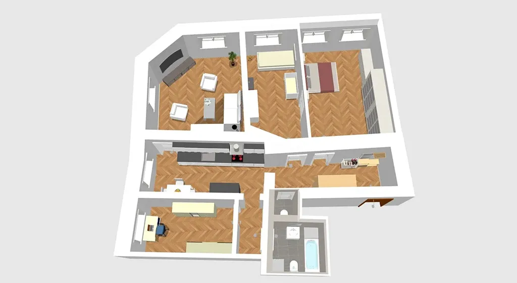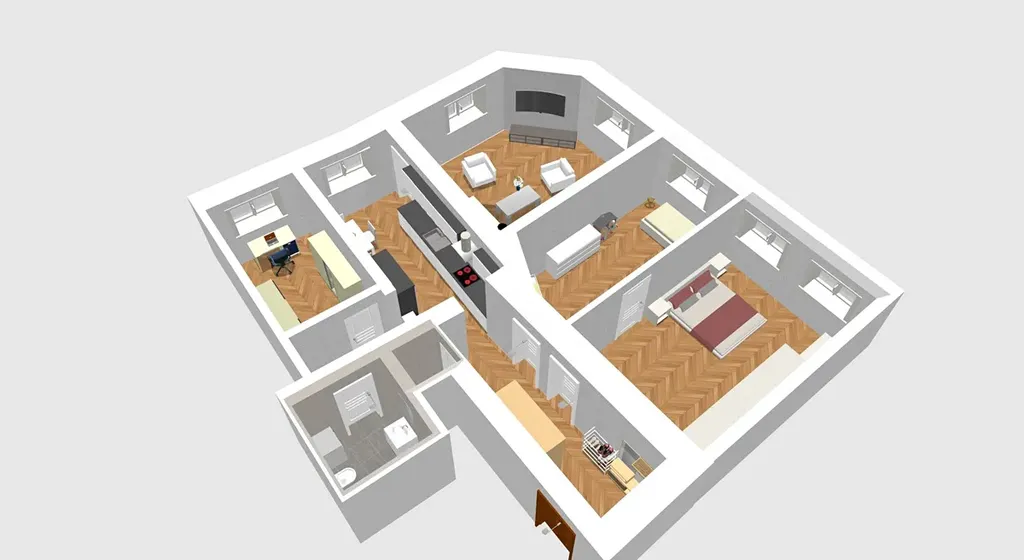 Byt je velmi dobře dispozičně řešený – všechny pokoje mají samostatné vstupy z chodby, což zajišťuje dostatek soukromí a široké možnosti využití. Dispozice je ideální pro rodinné bydlení, ale také pro kombinaci bydlení a práce z domova či investiční záměr.