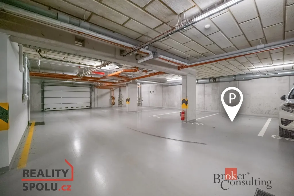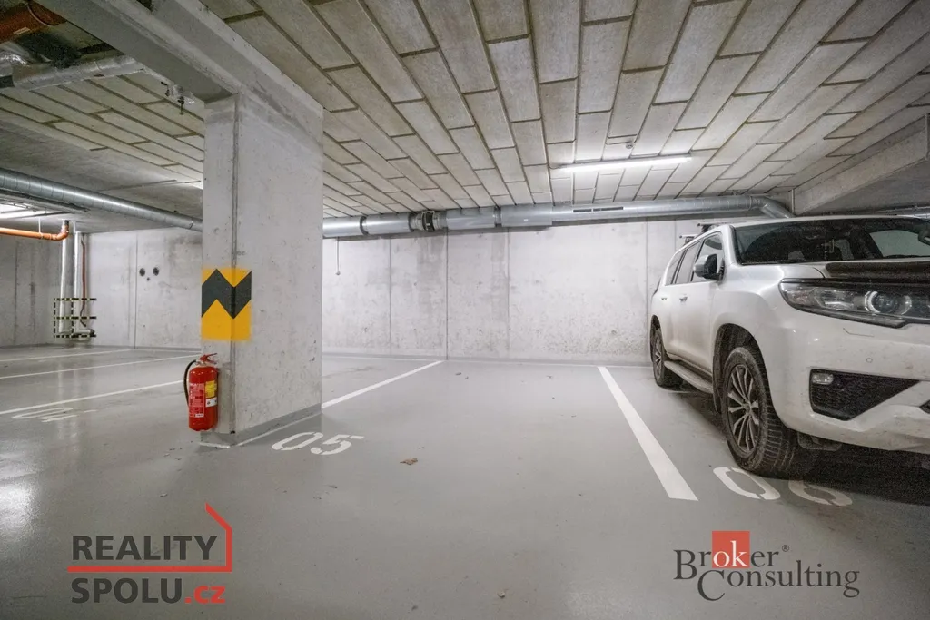 K bytu náleží sklepní kóje a kryté parkovací stání v budově (č. 5).