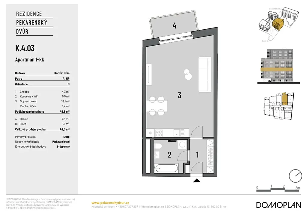 Nabízíme k prodeji moderně navržené jednotky 1+kk o celkové ploše 43,6 m2 s balkonem o velikosti 4,3 m2. Dispozičně jsou jednotky řešeny obývacím pokojem s kuchyňským koutem, koupelnou se sociálním zařízením a předsíní.
