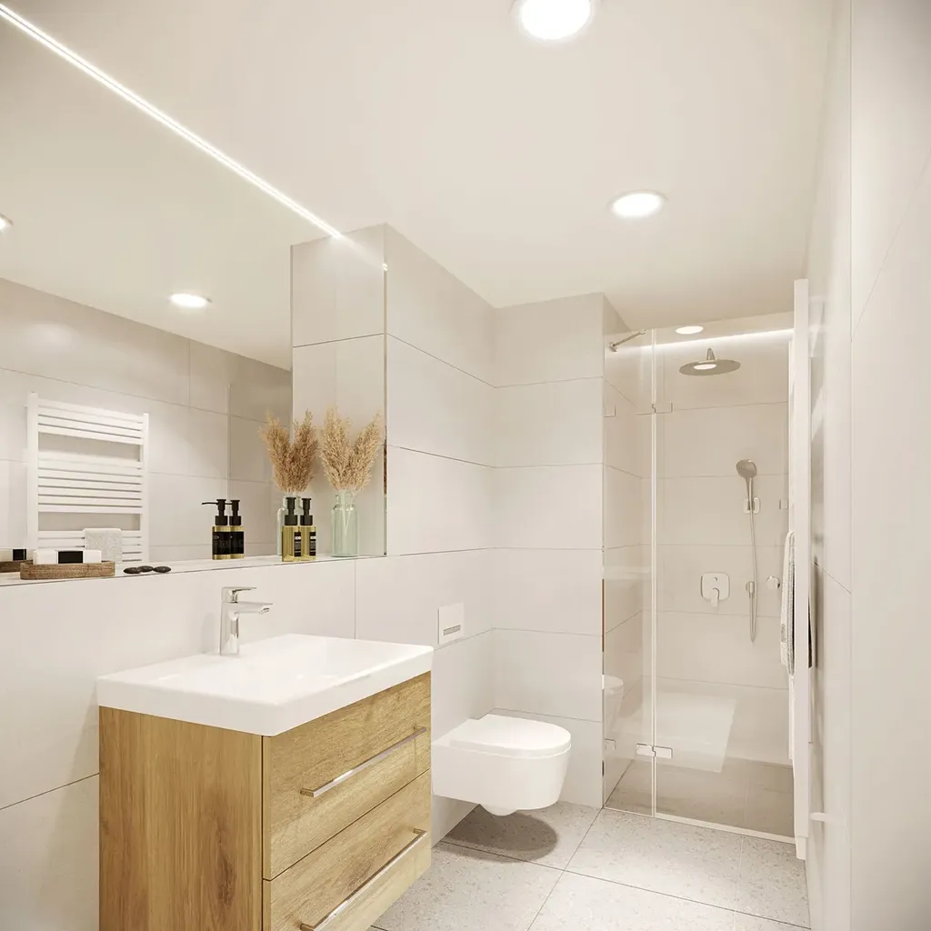 Na detailech záleží – proto jsou v základním standardu zahrnuty vícevrstvé dřevěné podlahy, hliníková okna s izolačním trojsklem, dálkově ovládané screenové rolety a velkoformátové obklady. Díky subtilním rámům oken proudí do interiéru maximum denního světla, zatímco kvalitní materiály a izolace zajišťují komfort v zimě i v létě.