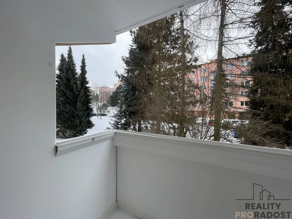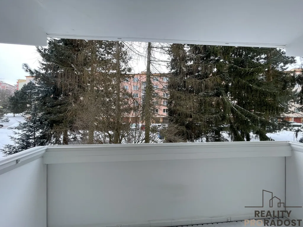 Z bytu je výhled na parkoviště a dětské hřiště, z balkonu pak na zelenou plochu se vzrostlými stromy, které zajišťují dostatek soukromí.