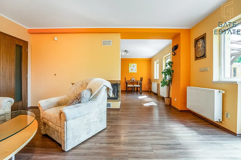 Interiér zaujme promyšleným a praktickým dispozičním řešením. V přízemí se nachází prostorný obývací pokoj s krbem, který je propojený s plně vybavenou kuchyní se zabudovanými spotřebiči a jídelním koutem. Z obytného prostoru je přímý vstup na terasu s pergolou, ideální pro posezení s rodinou nebo přáteli. Přízemí dále nabízí koupelnu a samostatné WC s umyvadlem.