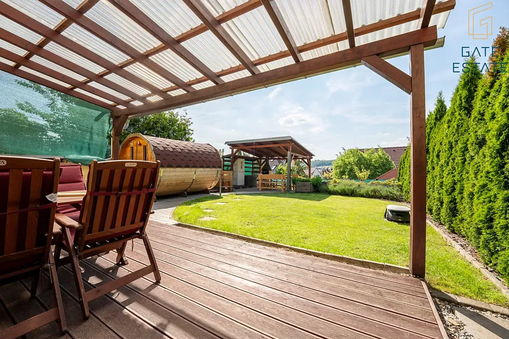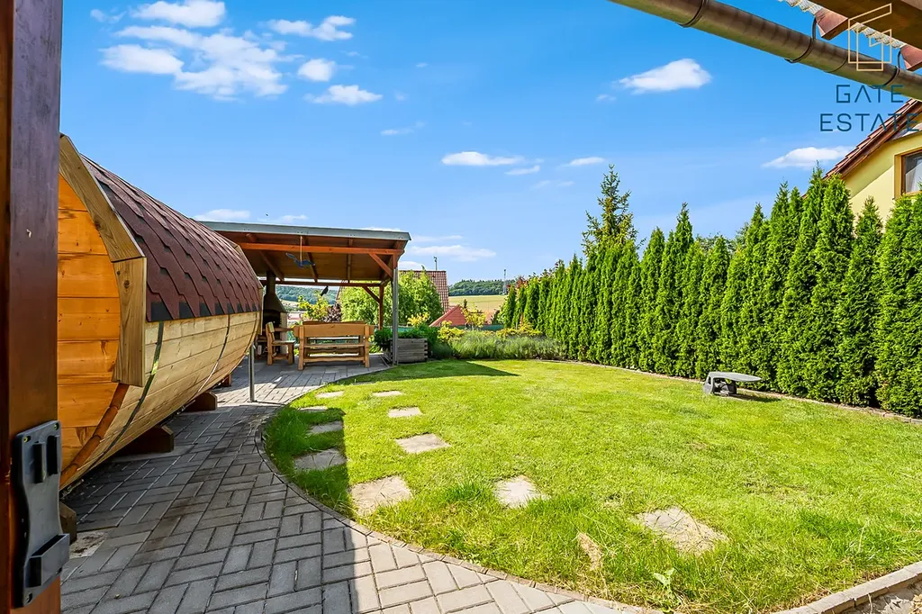 Zahrada je navržena tak, aby nabízela maximum soukromí i možností k relaxaci. Kromě terasy s pergolou zde najdete ještě jednu větší pergolu s posezením u grilu, ideální pro rodinné oslavy a setkání s přáteli. Pro odpočinek a regeneraci slouží finská sudová sauna a otužovací sud. Součástí zahrady je rovněž zahradní domek pro uskladnění venkovního vybavení. Parkování je zajištěno v garáži a další parkovací místa jsou k dispozici přímo před domem.