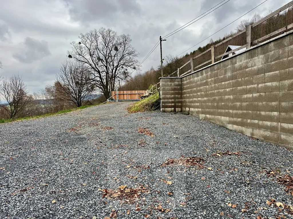 Příjezd je celoroční, bezproblémový, s velkou parkovací plochou z kameniva se stavebním povolením na výstavbu parkovacího přístřešku.