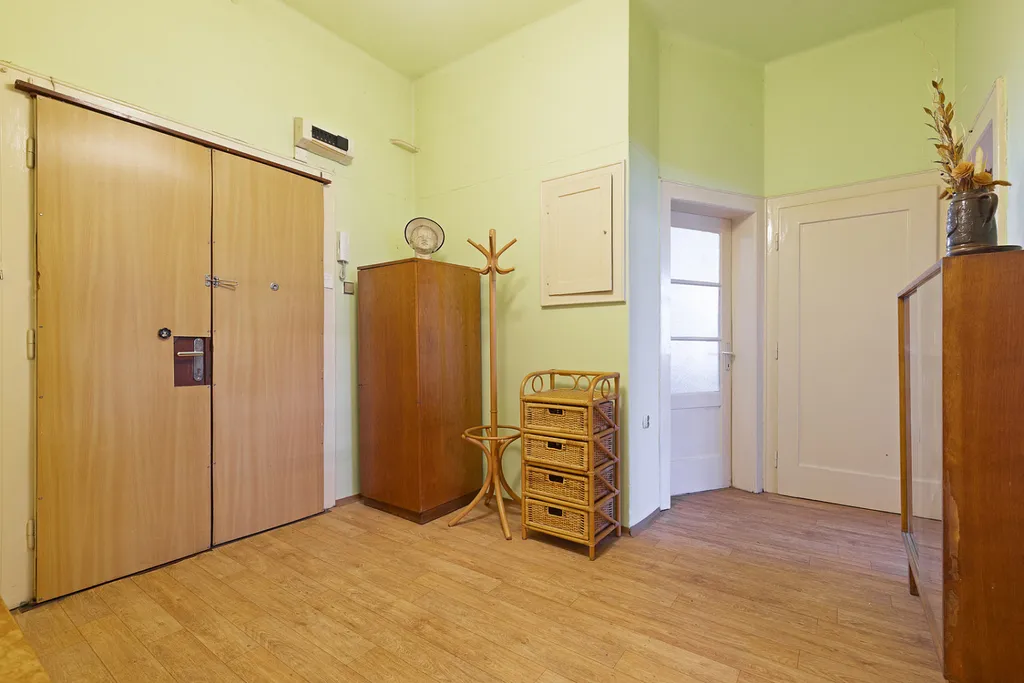 Byt vás přivítá širokou vstupní halou, vysokými stropy, původními parketami, masivními dvojkřídlými dveřmi a dřevěnými kastlovými okny, která dnes jen tak neuvidíte. Dispozice zahrnuje kuchyni s velkou spíží, tři prostorné neprůchozí pokoje, toaletu a úložné prostory. K jednotce náleží také sklepní kóje o velikosti 2,8 m².