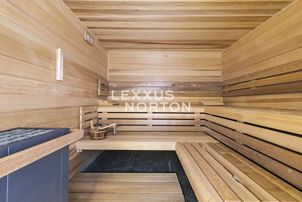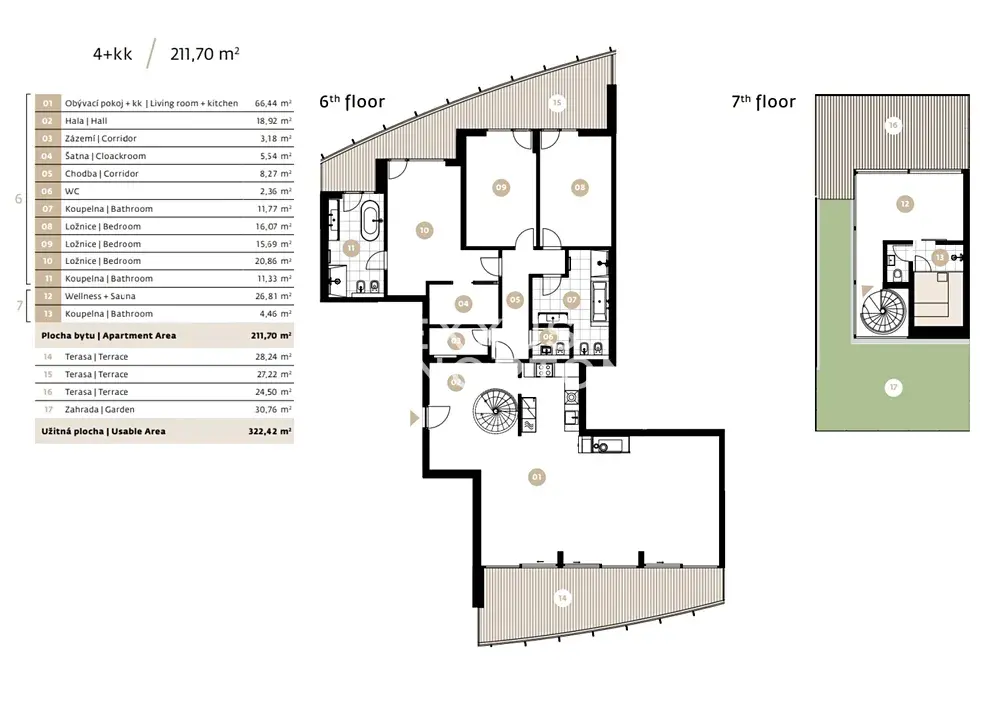 Byt je situován v 6. nadzemním podlaží a nabízí k užívání obývací pokoj s krbem a kuchyňským koutem odkud je rovněž uzpůsoben vstup na terasu (28 m2). Jednotka dále nabízí k užívání 3 ložnice rovněž se vstupy na terasu (27 m2), 3 koupelny, šatnu a samostatnou toaletu. Horní úroveň bytu je tvořena privátním wellness se saunou a vstupem na střešní terasu (25 m2) a zahradu (31 m2). Možnost využívání Wellness přímo v bytovém projektu za členský poplatek 2500 Kč/měsíčně. Možnost pronájmu garážového stání za 230 EUR + DPH měsíčně. V přízemí rezidence se nachází také fitness Prisma institut.