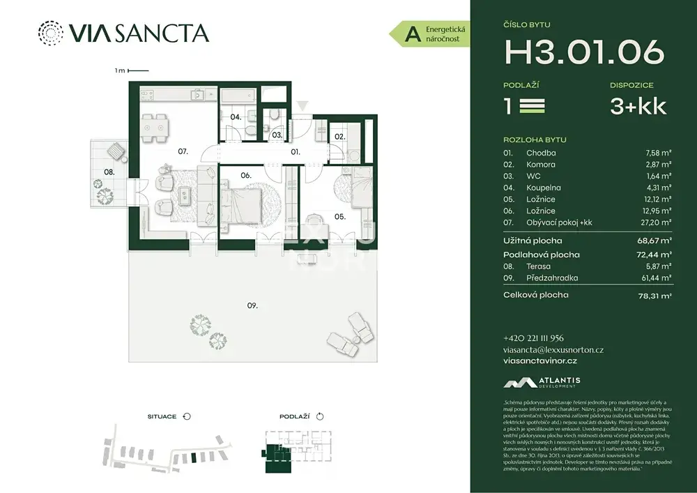 Hlavním benefitem tohoto bytu 3+kk o ploše 72,44 m² je kombinace prostorné terasy o velikosti 5,87 m² a předzahrádky o velikosti 61,44 m², která poskytuje dostatek soukromí i prostoru k odpočinku. Obytný pokoj s kuchyňským koutem je přirozeným centrem bytu a umožňuje přímý vstup na terasu, stejně tak jako obě ložnice. Vstupní hala nabízí dostatek místa pro úložné prvky, komoru, koupelnu s vanou a samostatné WC. K bytu náleží sklepní kóje a možnost venkovního či garážového parkování.