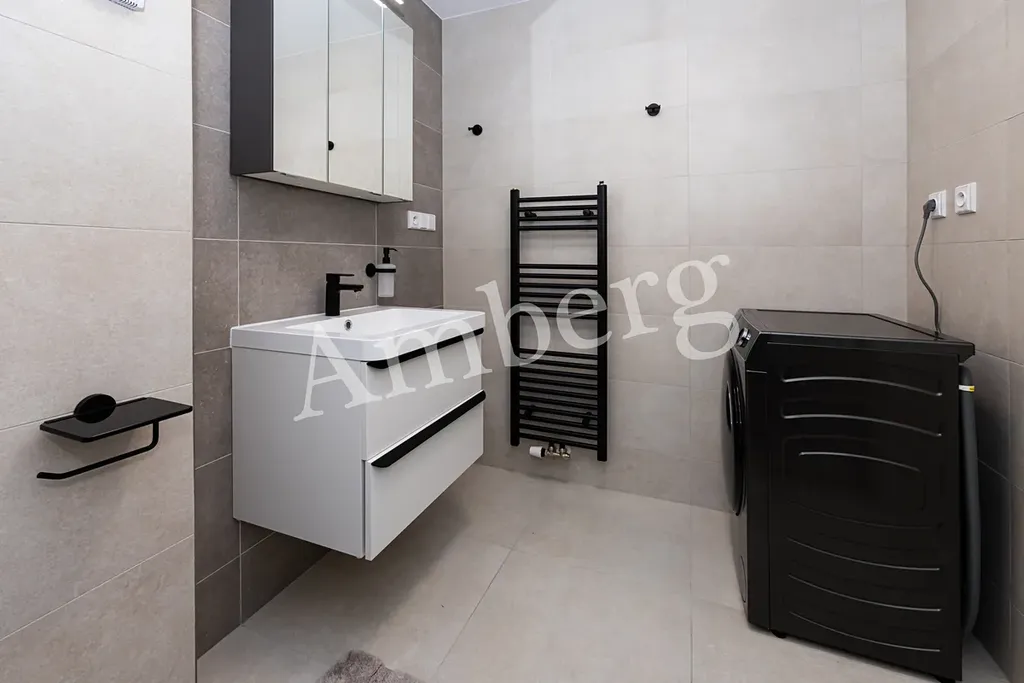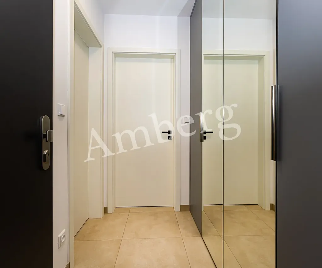 Byt je vkusně zařízen nábytkem na míru, včetně kuchyňské linky s myčkou a indukční varnou deskou, vestavěné skříně s trezorem.