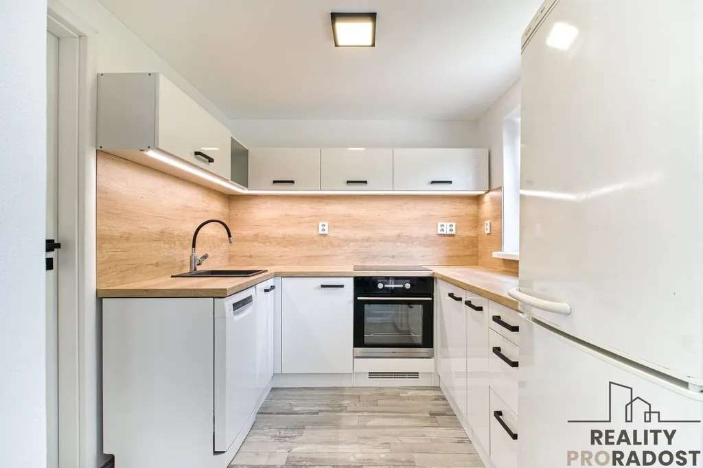 Kuchyně do tvaru U kombinuje dekor lesklé bílé a dřevodekoru. Nachází se zde indukční varná deska, elektrická trouba, granitový dřez v černé barvě s baterií, LED osvětlení horních skříněk. V koupelně se nachází walk-in sprchový kout, umyvadlová skříňka, úložné prostory, toaleta a příprava na pračku. Z obývacího pokoje je výstup na terasu, která je orientovaná do zahrady.