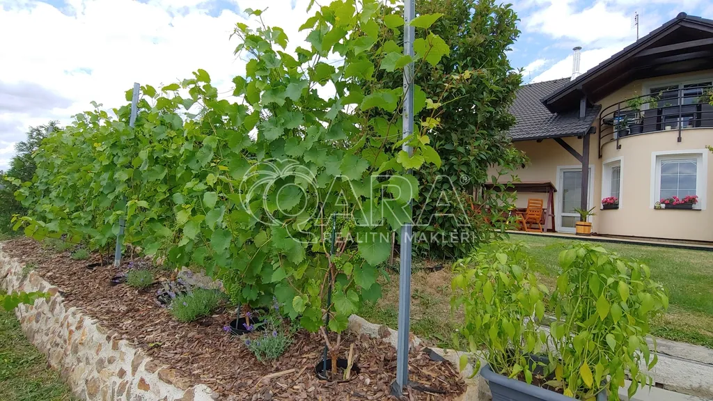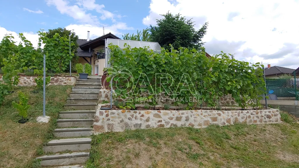 Z obývacího pokoje je vstup na zastřešenou terasu a zahradu, kde se nachází skleník, okrasné dřeviny i malá vinice. Zeleň poskytuje naprosté soukromí a vytváří příjemnou atmosféru pro relax i rodinná setkání.