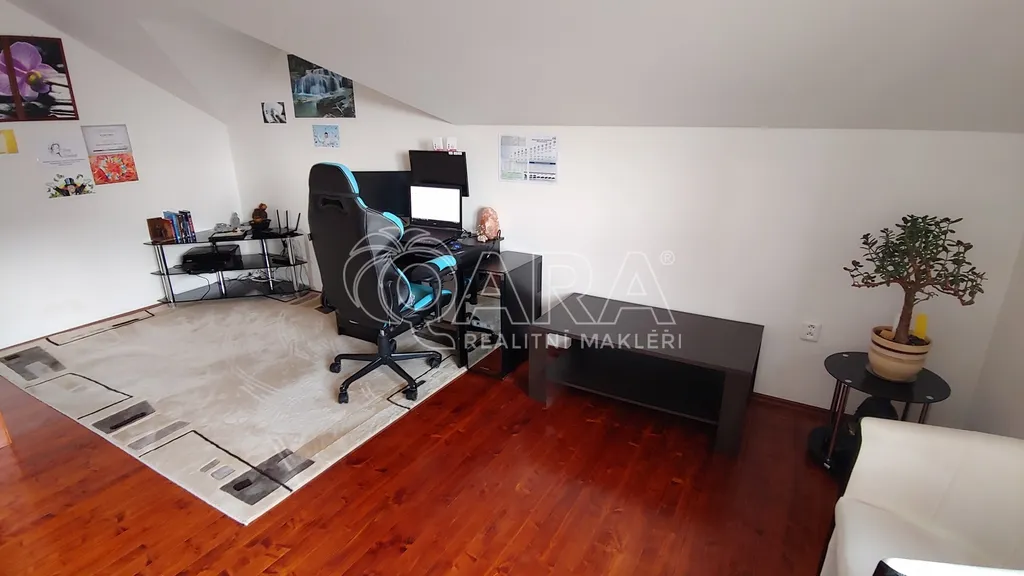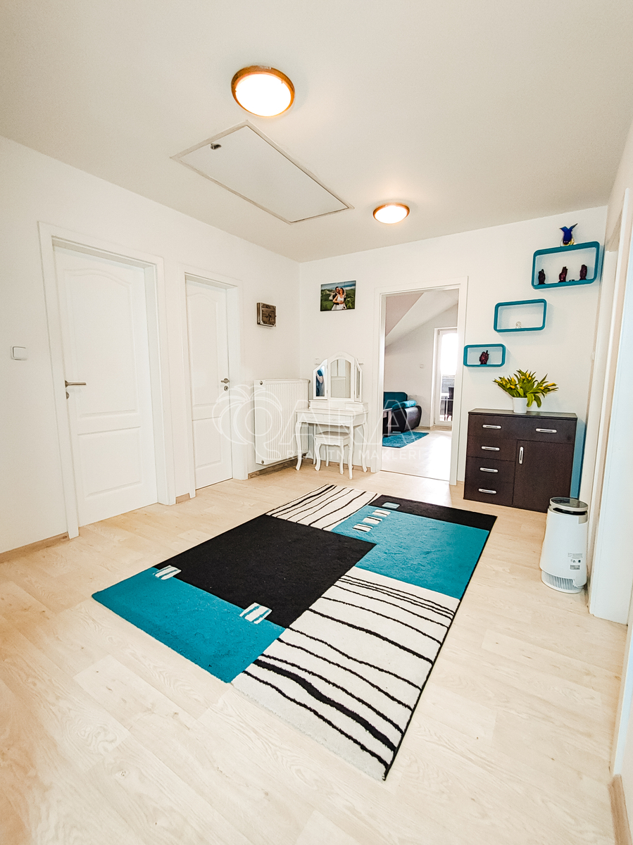 Z haly je také přístup na pochozí půdu – ideální pro uskladnění sezónních věcí. Horní patro lze snadno oddělit a využívat jako samostatný byt.
