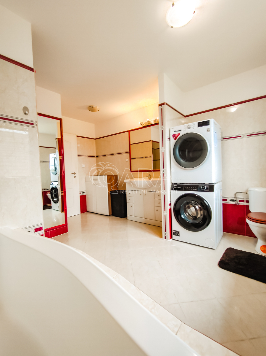Dále je zde koupelna s vanou, bidetem a toaletou, velká šatna a především obývací pokoj s krbem, propojený s moderní kuchyní a jídelním koutem. Kuchyně je plně vybavena vestavnými spotřebiči, navazuje na ni praktická spižírna a půlkruhový výklenek ideální pro rodinný jídelní stůl.