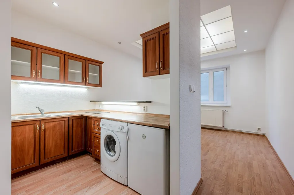 Samotný byt představuje tiché soukromé místo, je orientovaný do dvora a je výborně dispozičně řešený. Skládá se z předsíně, obývacího pokoje s kuchyňským koutem, dále z ložnice a koupelny. Kuchyňská linka s barovým pultem je vybavena spotřebiči (dvouplotýnková varná deska, lednička, pračka). Koupelna má sprchový kout, umyvadlo, toaletu a topný žebřík.