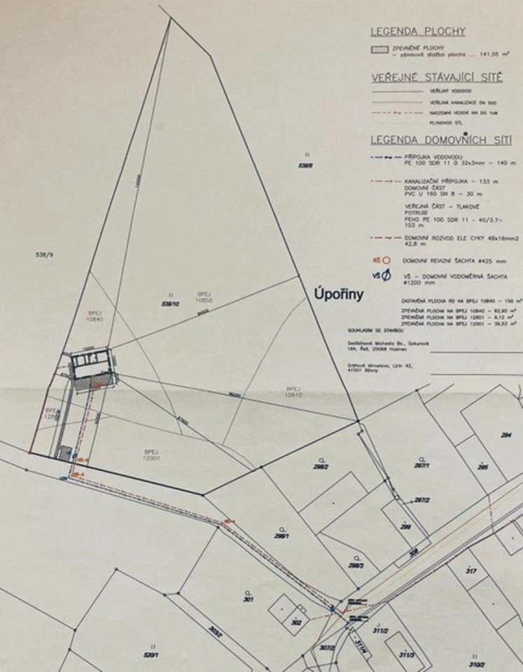 Celková plocha pozemku je až do velikosti 14 443 m2, minimální velikost pozemku k prodeji je 2 000 m2. Umístění aktuálního projektu (vyhloubena základová jáma) je vyznačeno v přiloženém zákresu. Na tento projekt jednopodlažního RD bylo vydáno stavební povolení.