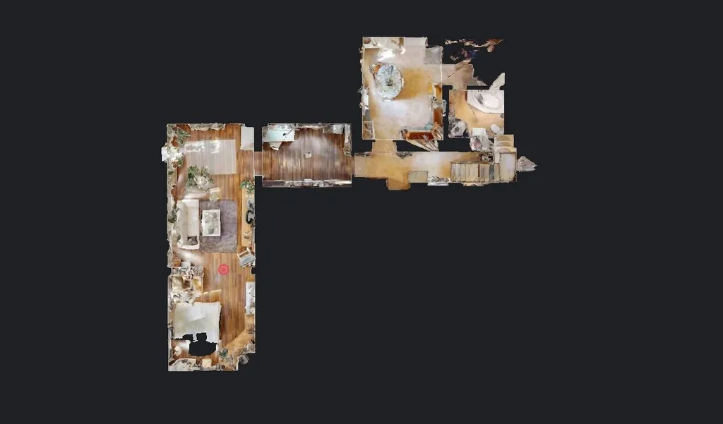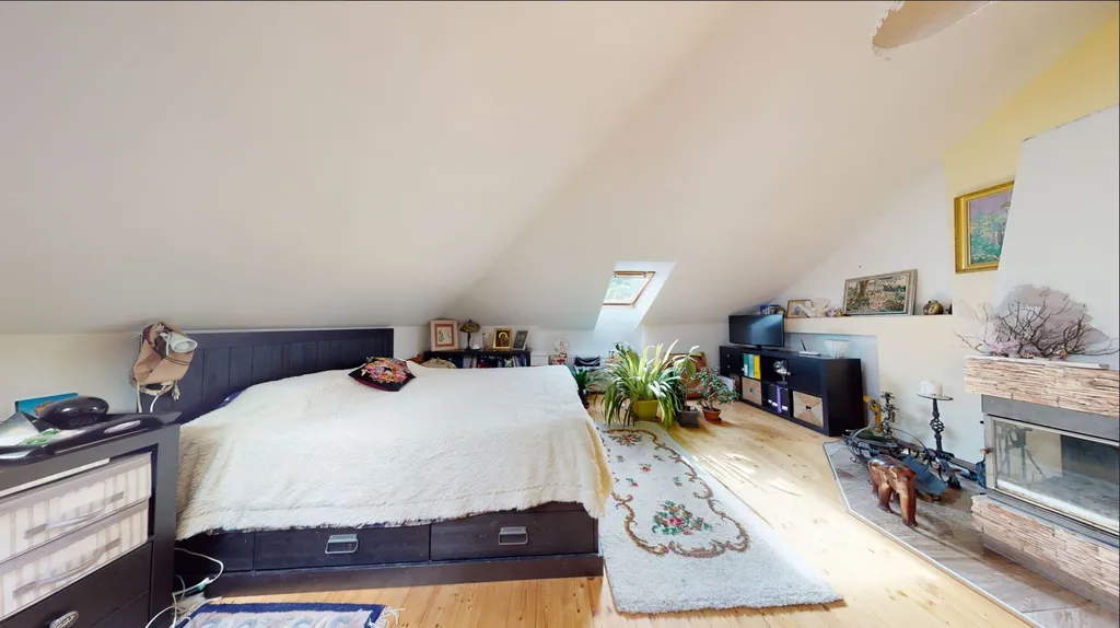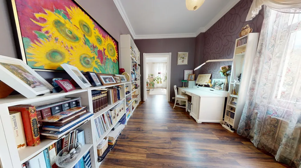 Po vstupu z centrálního schodiště se ocitnete v chodbě, odkud vedou dveře do útulné kuchyně s vestavěnými spotřebiči – el. trouba a varná deska. Kuchyní se dále dostanete do koupelny s WC a praktické komory, kde je umístěn elektrický kotel. Po levé straně chodby je vstup do prostorné pracovny a následně do velkého obývacího pokoje s funkčním krbem, který přispívá k útulné atmosféře bytu.