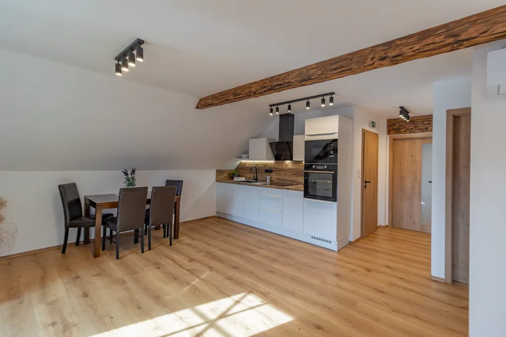 Apartmán č. 1. o podlahové ploše 47 m2 je kompletně moderně a vkusně vybavený jak elektrospotřebiči, tak nábytkem. Vnitřní dispozice 2+kk v 1. NP: vstupní předsíň, kuchyňský kout - kuchyňská linka (zn. Oresi s el. horkovzdušnou troubou s indukční deskou, mikrovlnnou troubou, lednicí s mrazákem zn. Mora). Jídelní koutek s obývacím prostorem včetně nábytku a TV ; ložnice. Koupelna (se sprchovým koutem, umyvadlem, topným žebříkem a připojením k pračce, baterie – Grohe, sanita - Geberit), samostatné WC. V rámci rekonstrukce bylo provedeno zaizolování stropů, položeny protihlukové podlahy, plovoucí podlaha zn. Quick – Step a protihlukové stěny mezi apartmány, okna dřevěná s dvojskly. Vytápění je řešeno klimatizací Haier - ovládanou tel., vjezdová brána ovládaná tel. a kódovým systémem, samostatné připojení wifi, kamerový systém v celém komplexu. K bytu náleží kój (5m2), jedno parkovací stání u domu a společné venkovní prostory k odpočinku. Voda čerpána z vrtané studny, odpad řešen ČOV. V rezidenci je dále k dispozici využití sauny a fitness.