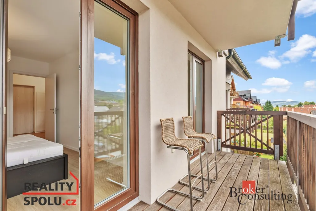 Dispozice bytu zahrnuje vstupní chodbu s úložným prostorem, koupelnu, obývací pokoj s kuchyňským koutem a samostatnou ložnici. Z obývací části i ložnice je přístup na krásný balkon s přímým výhledem na Ještěd.