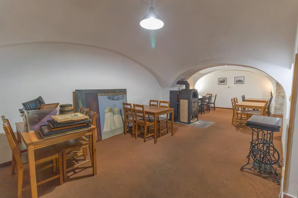 Vnitřní dispozice: vstupní prostor s barovým pultem, hlavní provozní místnost s klenbami o podlahové ploše 74m2 s krbovými kamny na dřevo, kuchyně se skladem o ploše 35m2. Sociální zařízení pro hosty a pro personál (7m2).