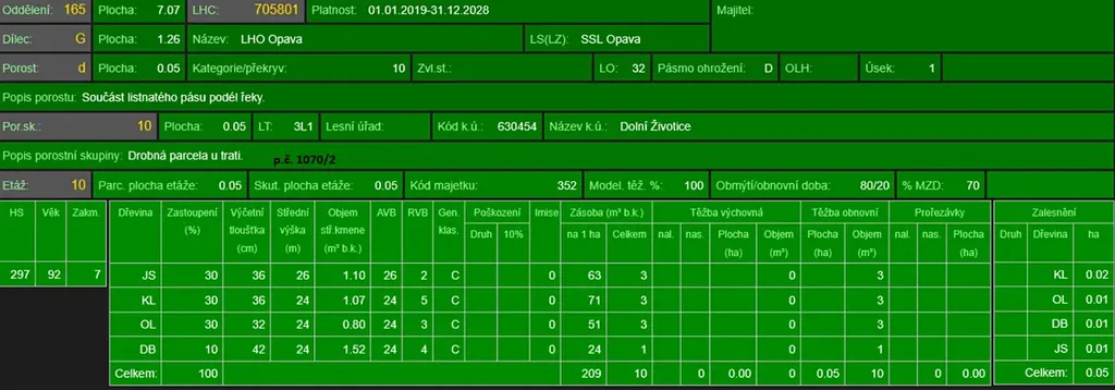 - p.č. 1070/2 vedená jako lesní pozemek o celkové výměře 461 m2 (stáří lesa 99 let - zastoupení dřevin jasan, javor, olše, dub),