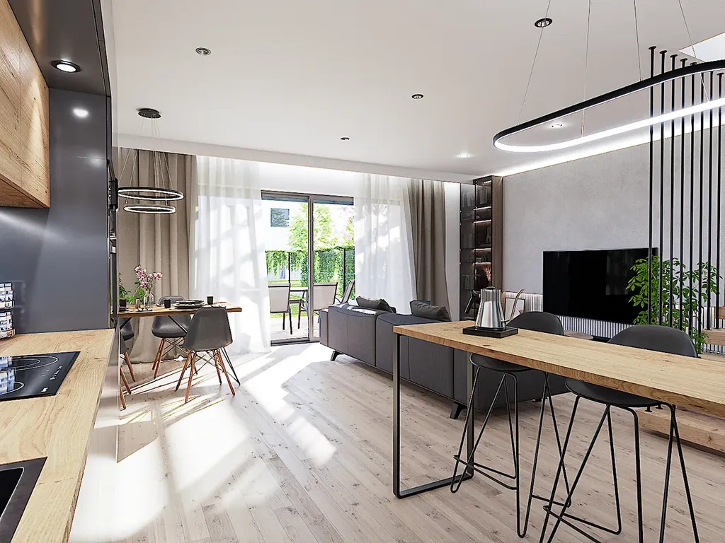 Dále vstupujete do nejdůležitější části domu a to je úžasně prosvětlený a prostorný obývací pokoj o velikosti s velkoformátovými okny, kuchyňským koutem a vstupem přímo na terasu. Zde si můžete užít odpočinek na zahradě nebo grilovat s rodinou. Tento prostor se stane srdcem Vašeho nového domova.