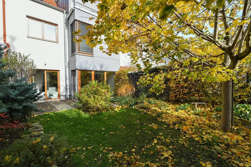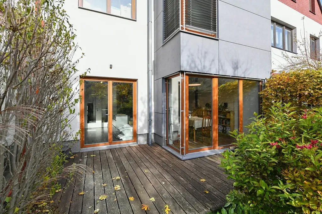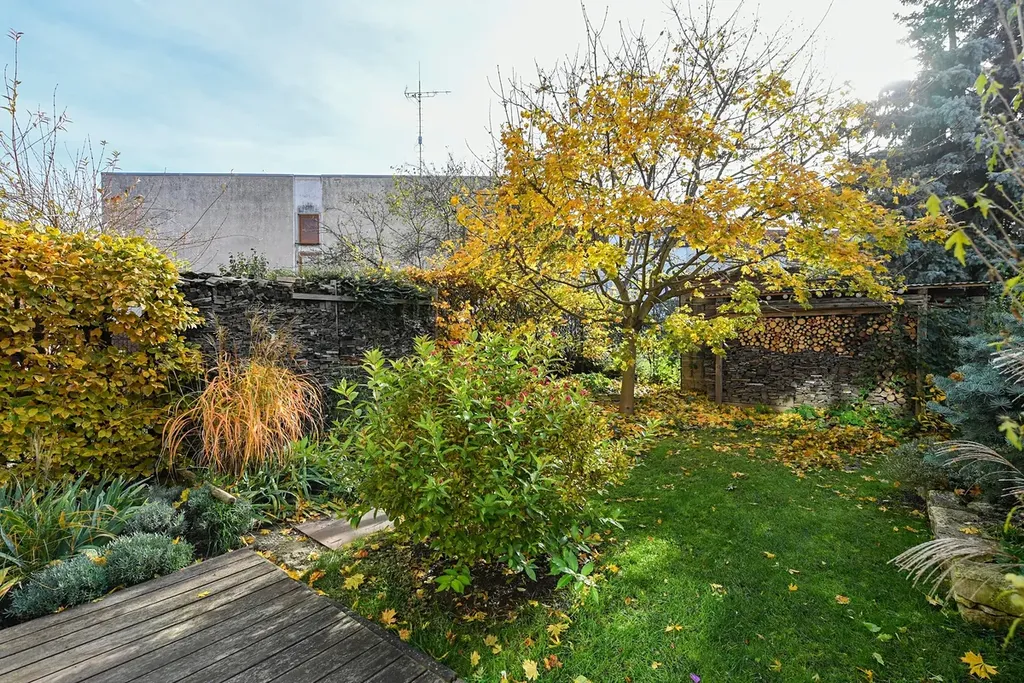 K domu náleží terasa a menší zahrada orientovaná do klidné části za domem, která poskytuje dostatek soukromí i přes centrální polohu domu. Parkování je možné v rámci modrých zón, jeden vůz je možné zaparkovat přímo před dům v rámci objektu.