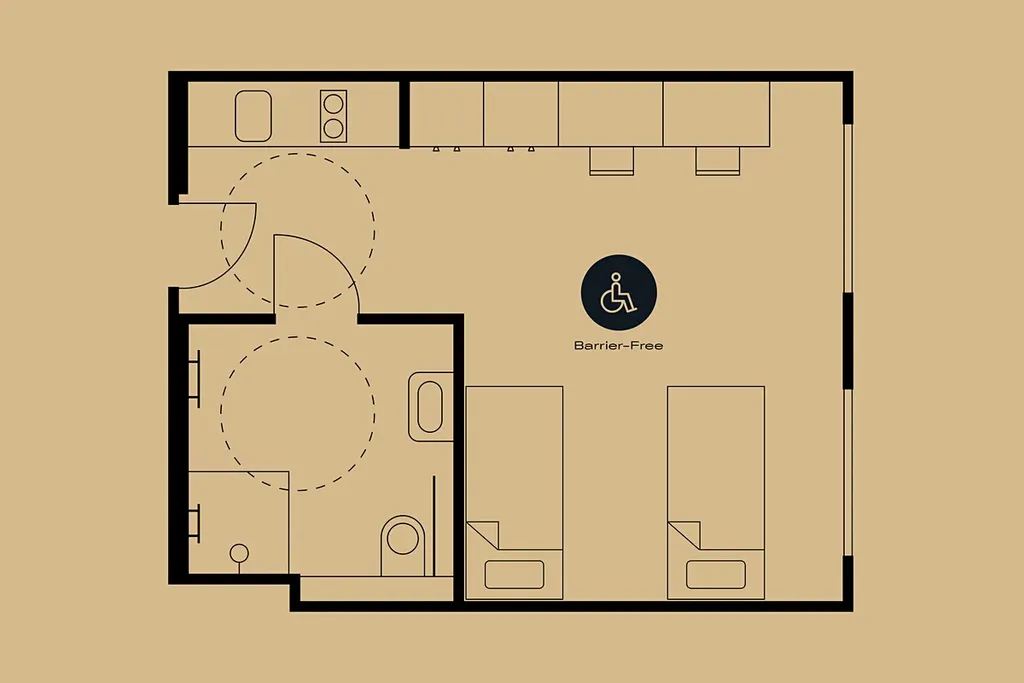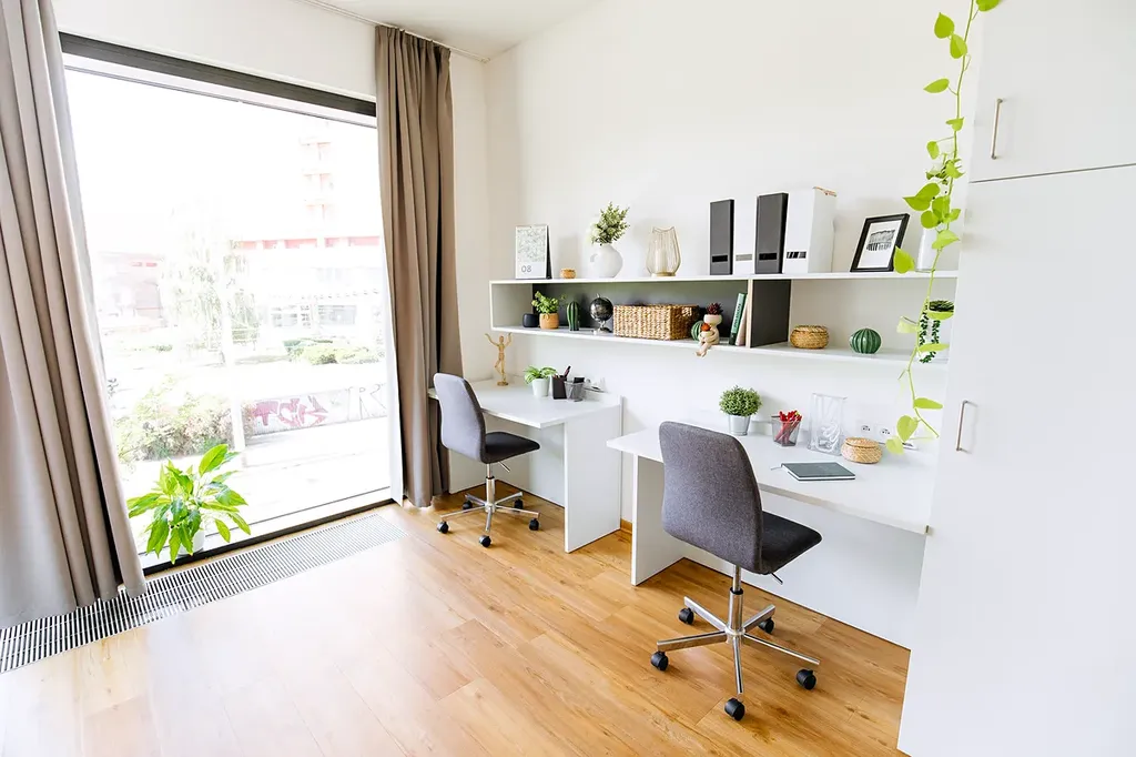 Toto sdílené studio /max pro dvě osoby, se nachází na 2. patře naší rezidence. Je velmi prostorné (30,70 m2) a světlé díky celoplošnému prosklenému oknu do ulice. Vzhledem k velkému prostoru je vhodné i pro lidi na vozíku, má ponížený nábytek o pár cm a prostornou koupelnu. Ventilace v tomto studiu je v rámci vnitřních prostor. Okno nelze z bezbečnostních důvodů otevírat.