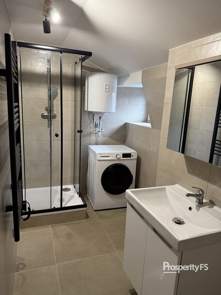 koupelna se sprchovým koutem, designovým žebříkovým radiátorem, pračkou a úspornými bateriemi