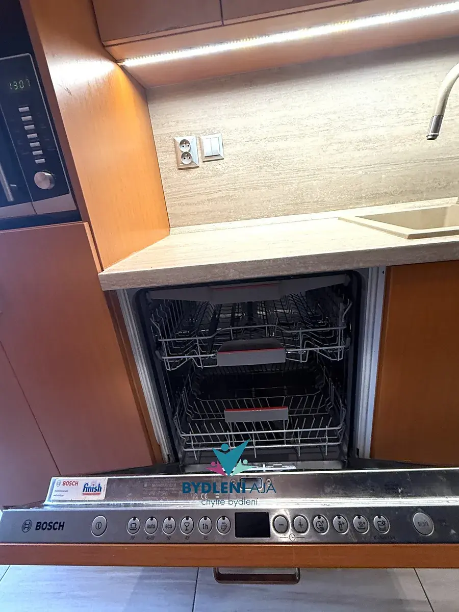 V bytě je kuchyňská linka s myčkou, lednice, pračka.