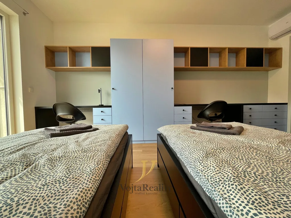 Okna jsou zde plastová s trojskly a jsou opatřeny venkovními žaluziemi. Ohřev vody i vytápění bytu jsou řešeny dálkově. V bytové jednotce je položeno podlahové vytápění. Nájemník má k dispozici kompletně zařízenou bytovou jednotku včetně ložního prádla. V bytě se nachází klimatizační jednotka. V patře je k dispozici kolárna a prádelna (pračka i sušička). Ve službách spojených s užíváním jednotky je zahrnut i úklid včetně výměny lůžkovin, který probíhá 1 x měsíčně.