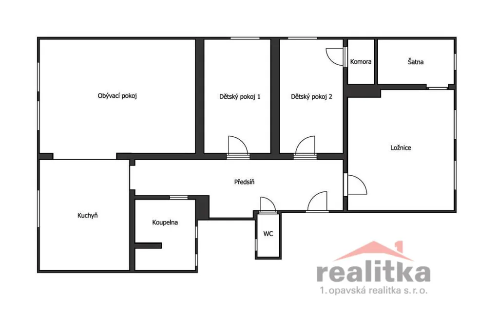 Dispozice bytu: předsíň, kuchyň, prostorný obývací pokoj, ložnice, dva dětské pokoje, šatna, komora, samostatné WC a koupelna se sprchovým koutem.