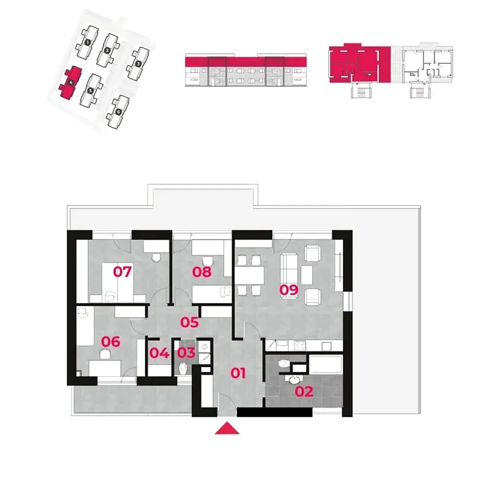 Podlahová plocha bytu 4+kk činí 102,5 m2. Ze všech pokojů je přístup na terasu o ploše 54,4 m2 a z ložnice je vstup na balkón o ploše 8,1 m2.