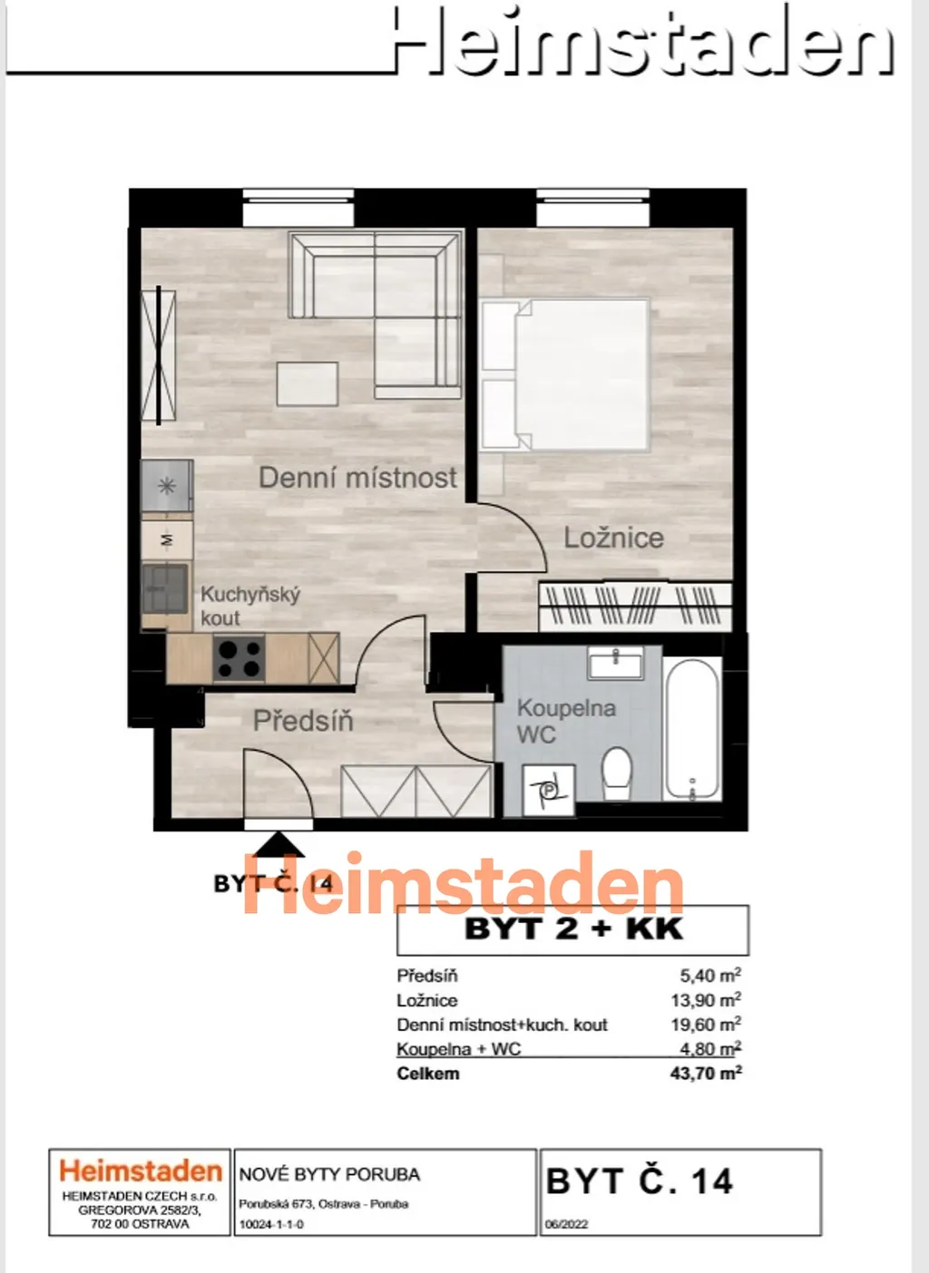 Hlavní obytný prostor tvoří moderní kuchyň s obývacím pokojem, která zaujme elegantní linkou s vestavěnými spotřebiči – včetně elektrické trouby, varné desky i myčky nádobí. Na kuchyň plynule navazuje obývací část, kde si snadno vytvoříte místo pro relax i společné chvíle. Z obývacího pokoje se vstupuje do ložnice, která poskytuje klidné zázemí a dostatek prostoru pro manželskou postel i úložné řešení.