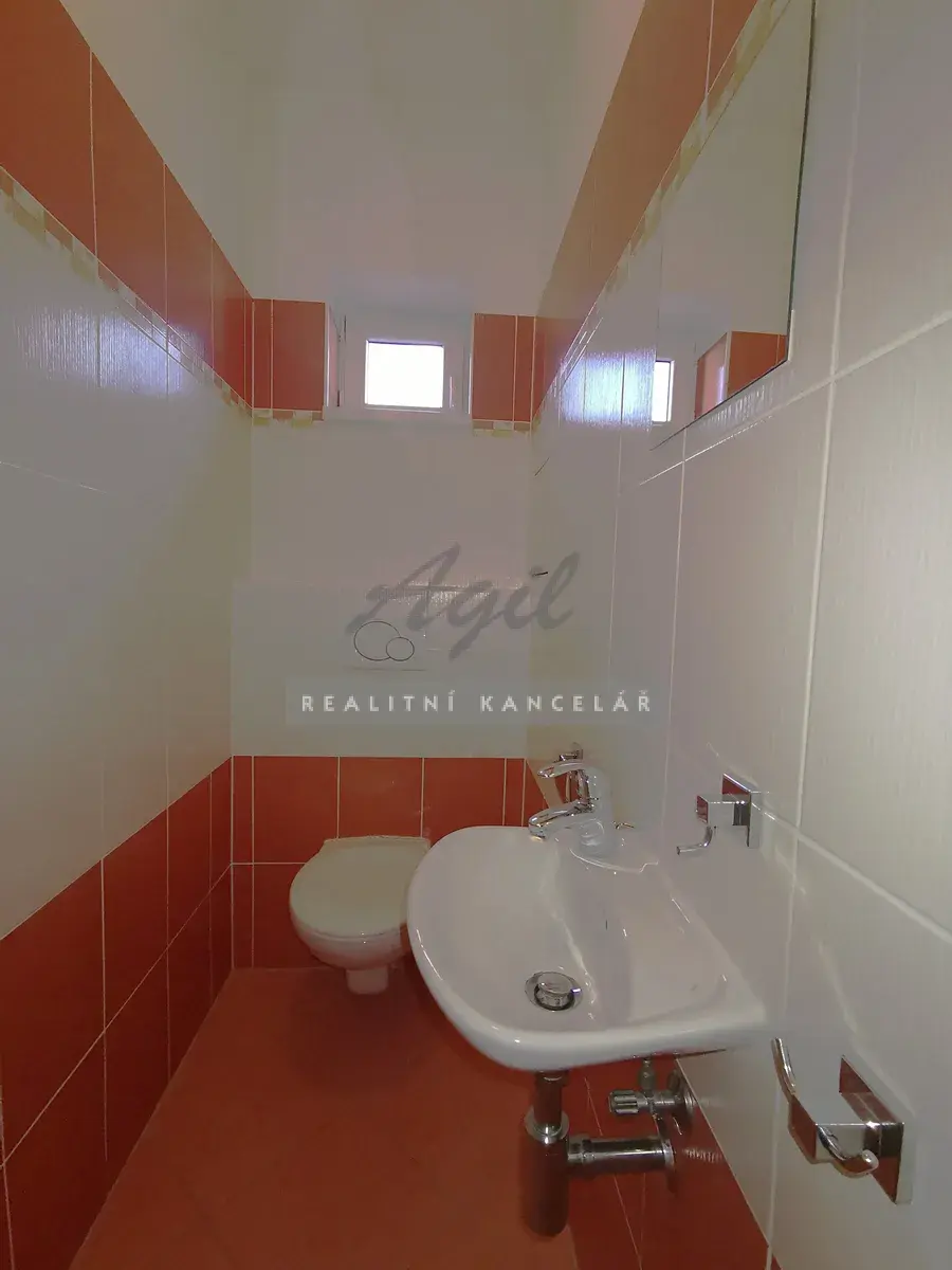 Koupelna – umyvadlo se spodní skříňkou, nástěnná skříňka se zrcadlem a s osvětlením, vana se zástěnou, kotel BAXI, přípojka na pračku, sušička.