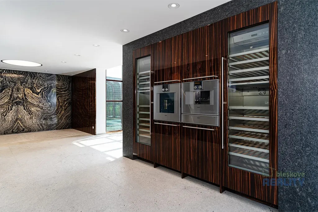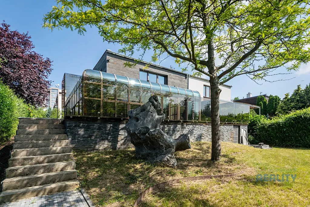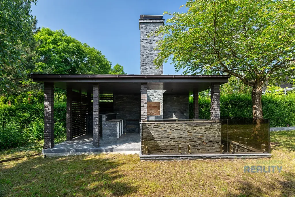 Na zahradě najdete zázemí pro letní kuchyni a stylový vinný sklípek. Pozemek navazuje na veřejnou zeleň, která zajišťuje klid a soukromí.