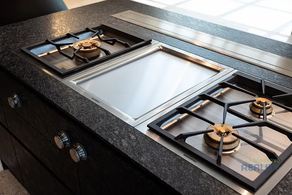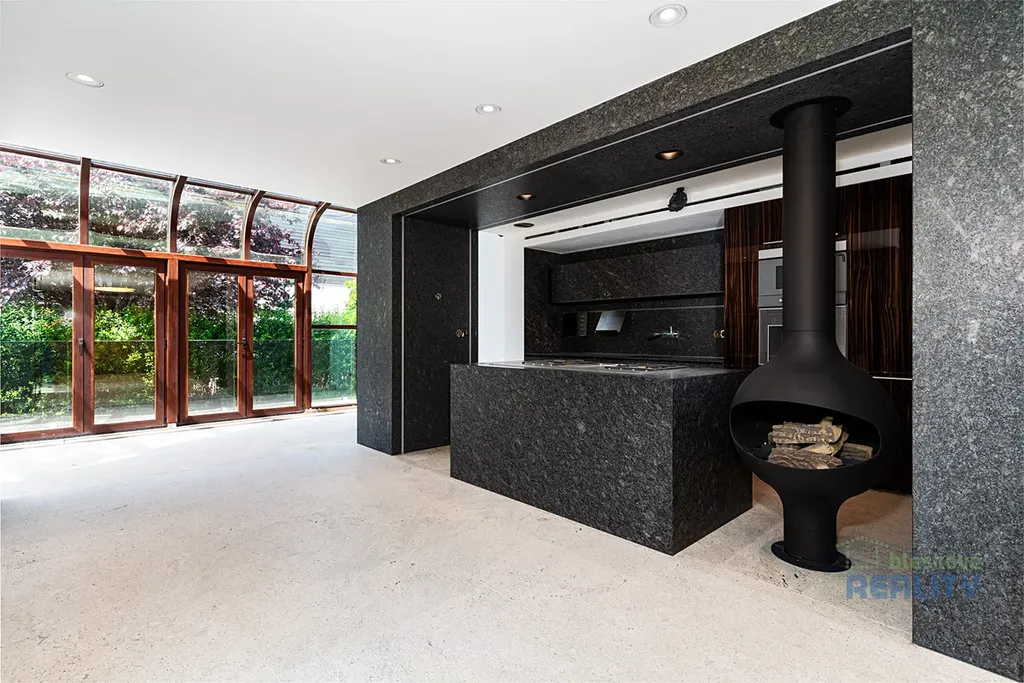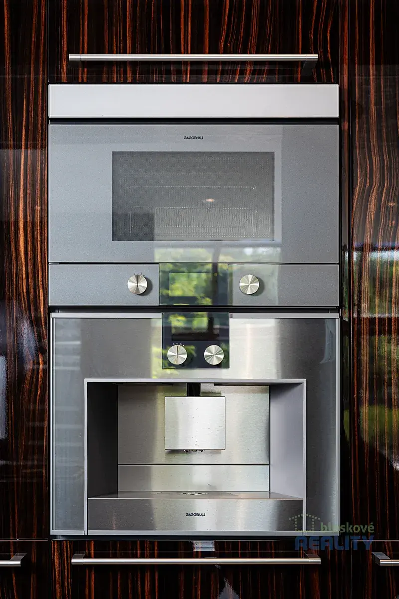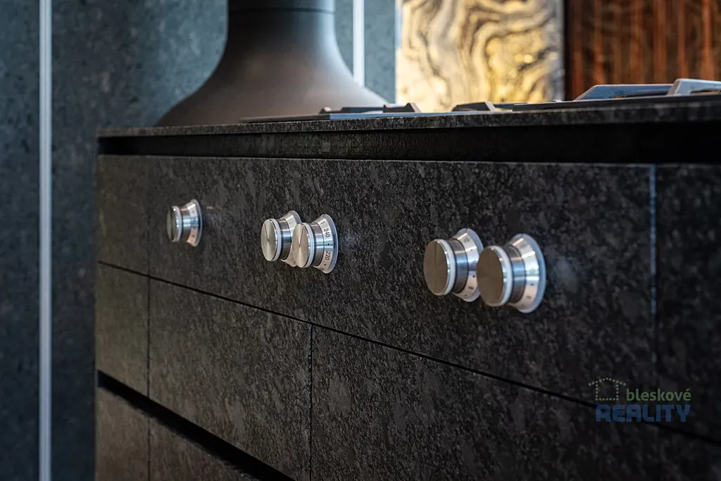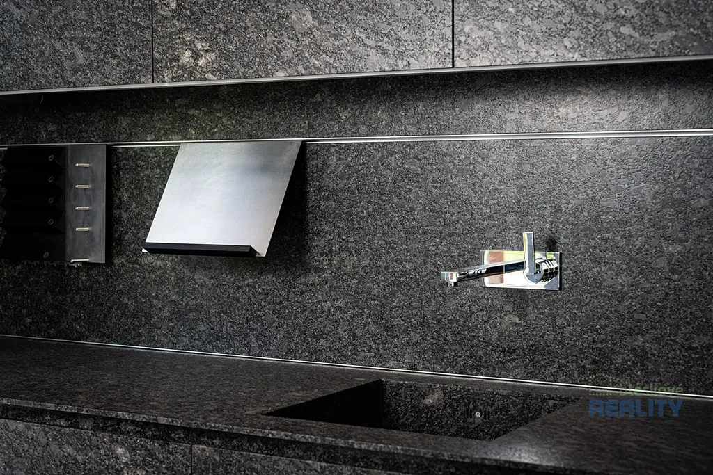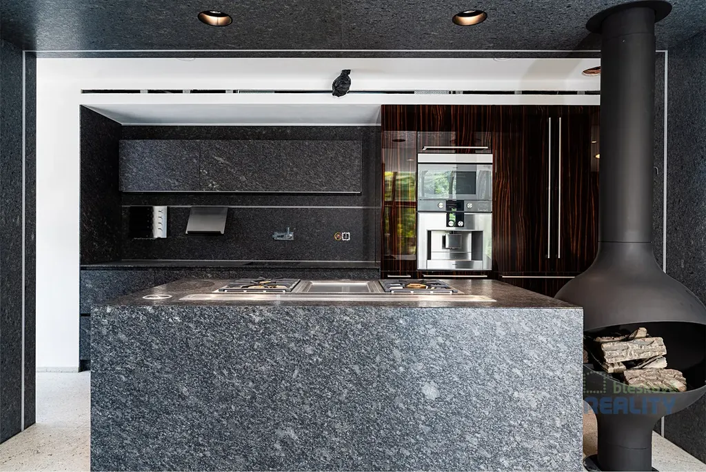 - kuchyňská linka z kartáčované a vypalované žuly s vestavnými spotřebiči Gaggenau