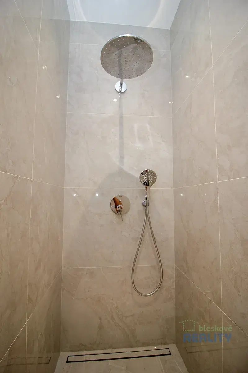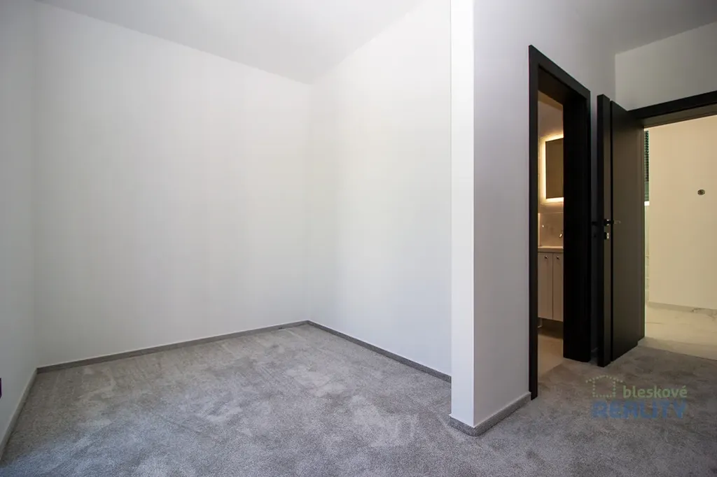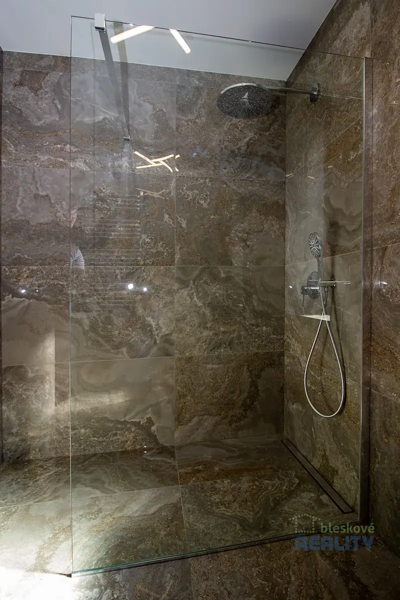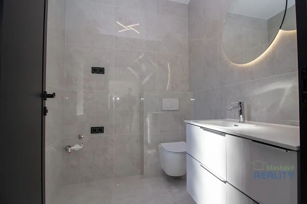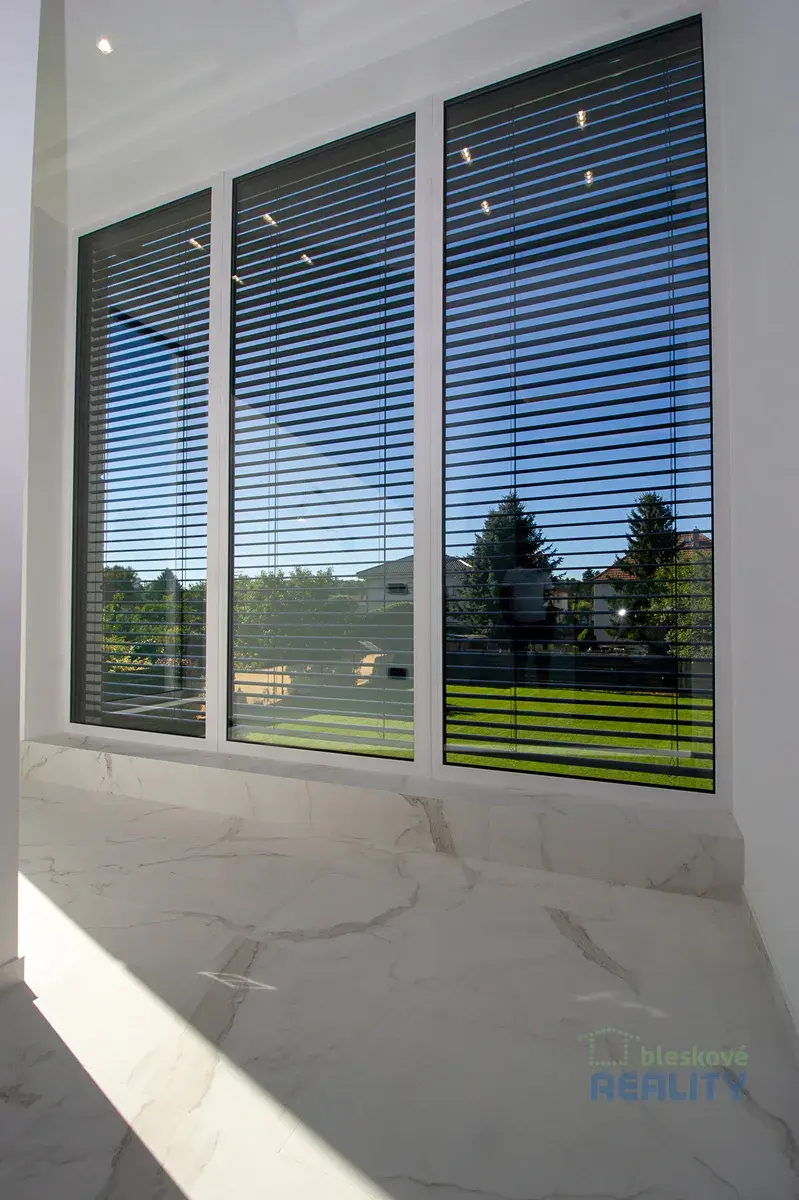 V patře jsou dvě velké ložnice s vlastní koupelnou (značkové vybavení Grohe), třetí pokoj vhodný jako pracovna či herna, společná koupelna, úklidová komora a otevřená galerie s velkými okny do zahrady – ideální pro odpočinek nebo klidnou práci.
