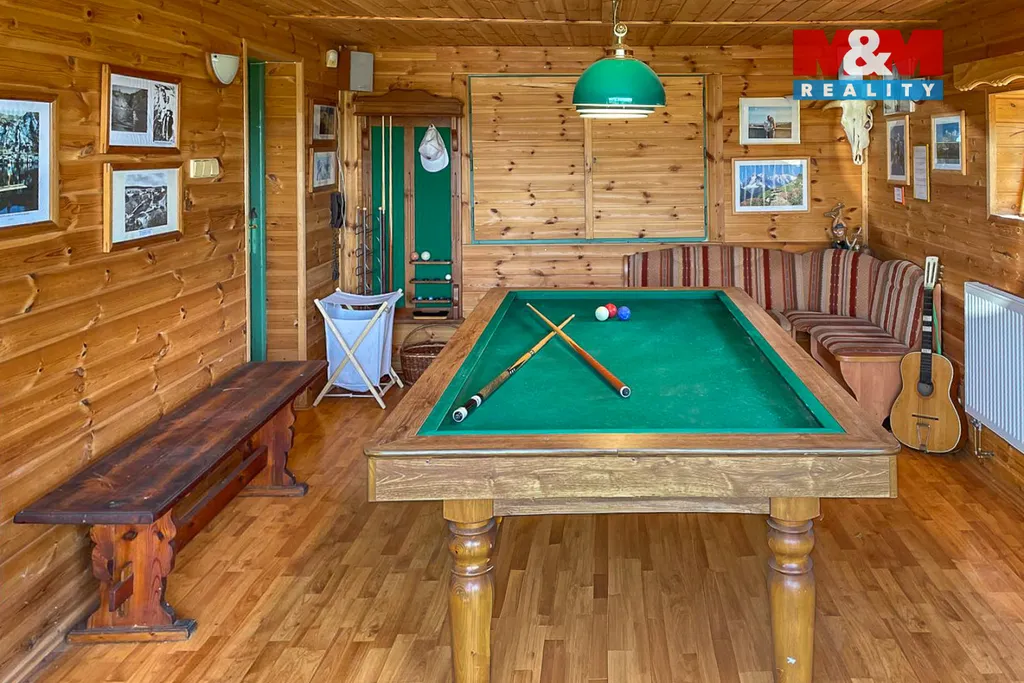 Chata má celkem tři podlaží a nabízí obytnou místnost s terasou, kuchyň a 2 ložnice v podkroví. Dalším zajímavých prostorem je garáž užívaná jako společenská místnost.
