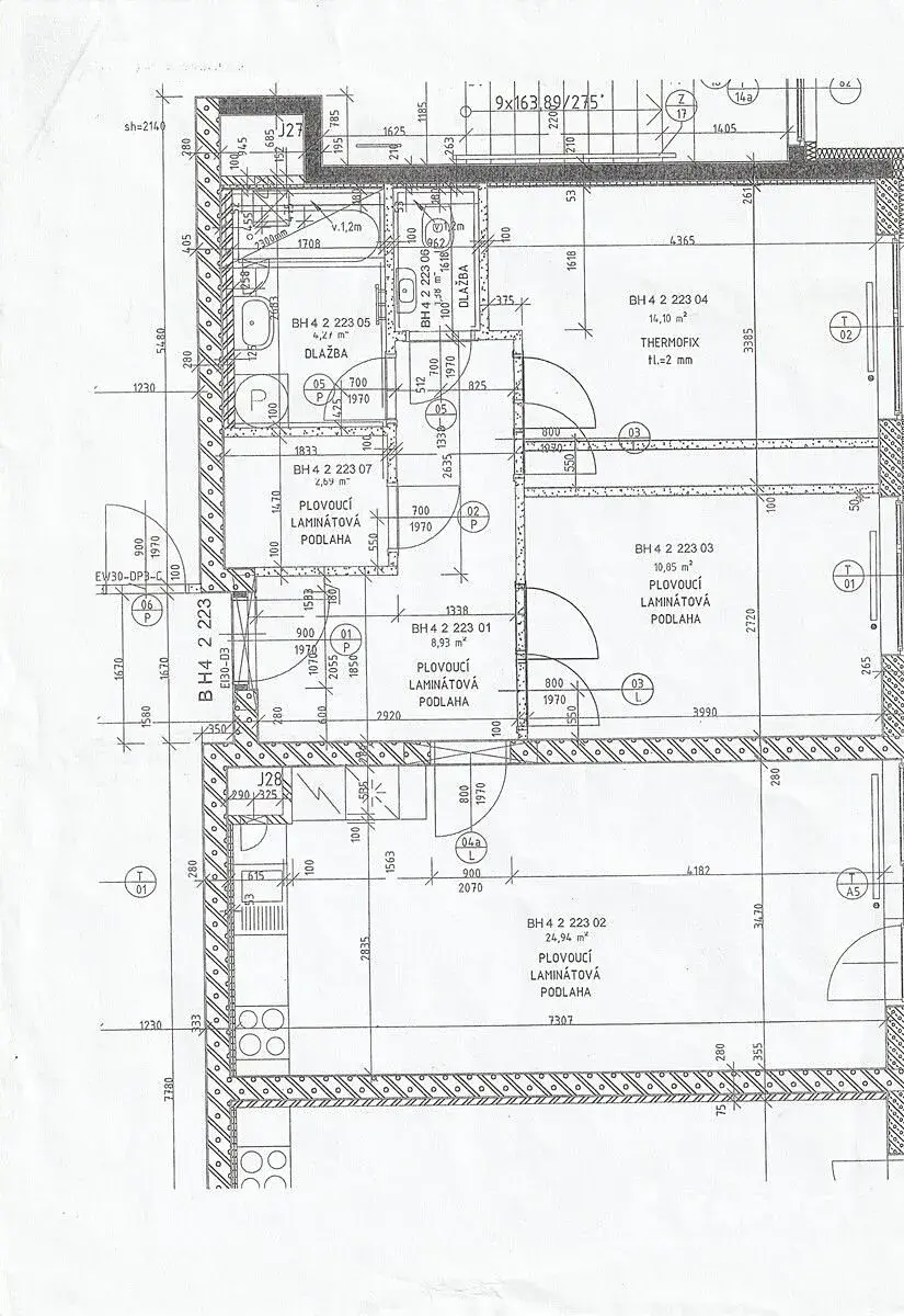 Podlahy v bytě jsou tvořeny plovoucí laminátovou podlahou, dlažbou a vinylem. Okna jsou plastová s dvojsklem.
