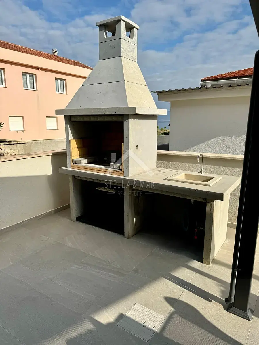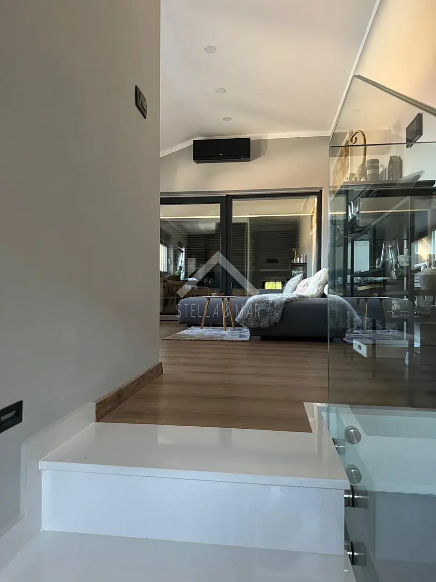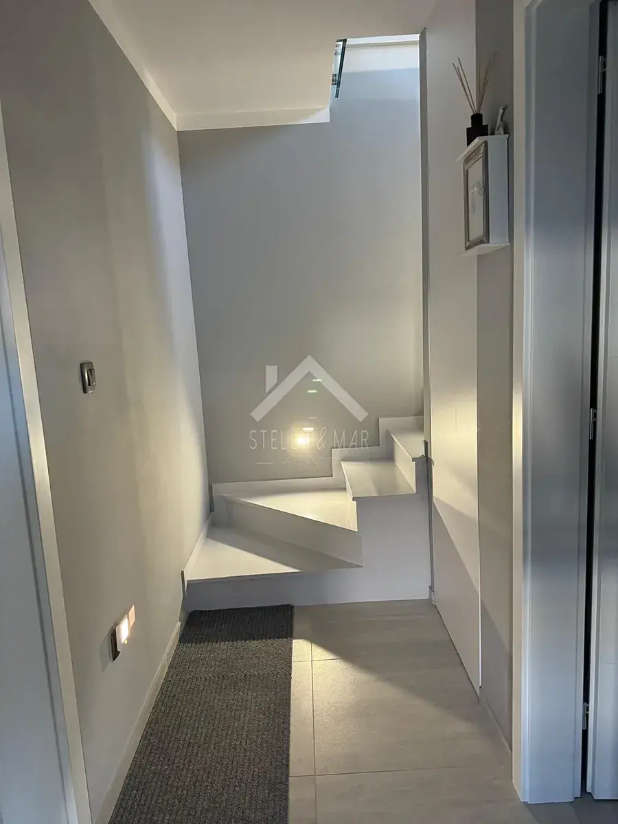 V prvním patře se nachází obývací pokoj s kuchyní, jídelnou a krytou terasou s krásným výhledem na moře.