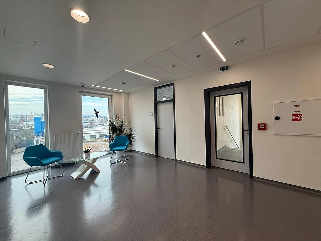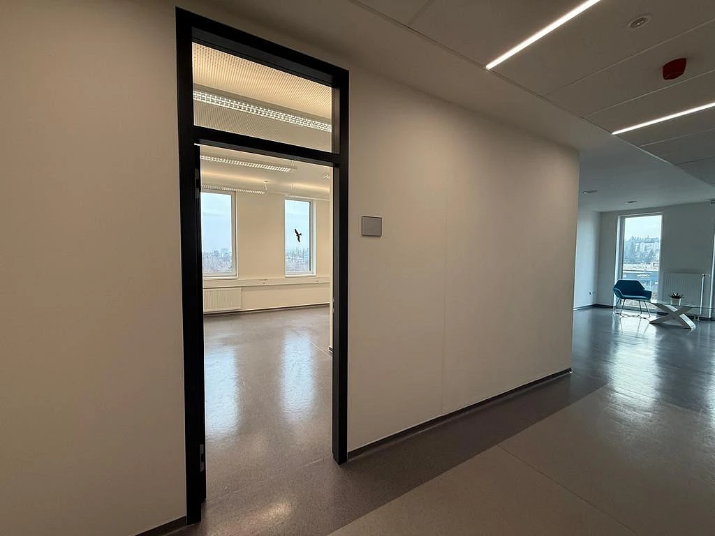 Prostor nalezneme v pátém patře budovy, do kterého se dostaneme pomocí výtahu. Kancelář o celkové ploše cca 18,20 m² je krásně prosklená a je z ní krásný výhled na Brno a působí moderním dojmem. Prostor se nabízí bez nábytku, ale je vybaven moderním elektrickým zařízením na rozsvícení prostoru a regulaci teploty, také jsou zde nainstalovány venkovní žaluzie. Na chodbě jsou společné prostory jako je dámské a pánské WC nebo velmi praktická kuchyňka. Společná kuchyňka je vybavená lednicí, mikrovlnnou troubou, varnou konvicí, dřezem a varnou deskou.