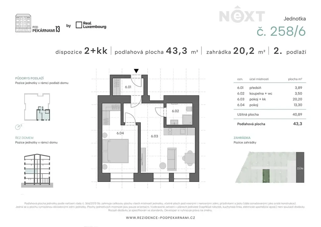 Rád bych Vám v rámci výhradního zastoupení developera představil byt 2+kk o podlahové ploše 43,3 m² v citlivě rekonstruovaném projektu Rezidence Pod Pekárnami 13, situovaném v klidné části Prahy 9. Byt se nachází ve 2. nadzemním podlaží, je orientovaný na jihovýchod, směrem do ulice a jeho benefitem je soukromá zahrádka o výměře 20,2 m².
