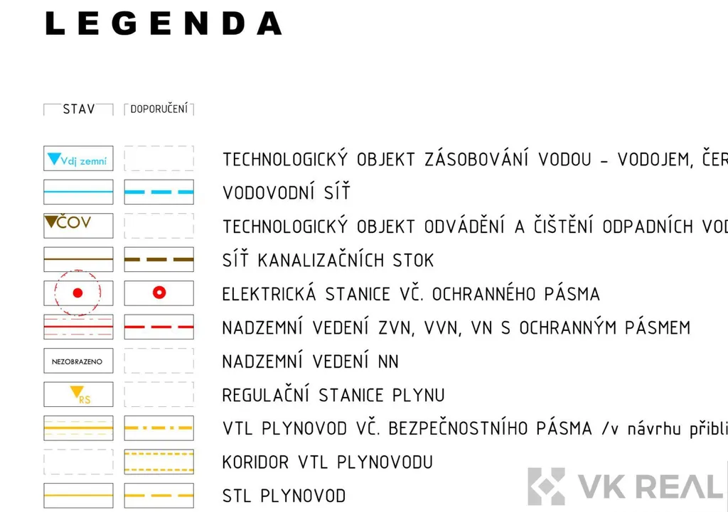 Co se týče inženýrských sítí, na pozemek je přiveden elektrický proud. Obecní vodovod se nachází přes silnici, tedy je potřeba počítat s protlakem pod silnicí na vzdálenost asi 15 až 20 metrů k hranici pozemku. Kanalizace je zhruba 150 metrů od pozemku, takže je pravděpodobně lepší řešit odpadní vody jímkou nebo vlastní čistírnou.