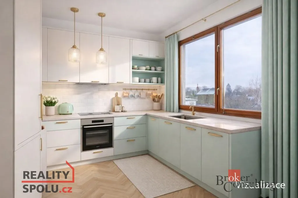 V prvním patře se nacházejí 3 obytné pokoje (jeden s rozlehlým balkonem 4,2 m2). Dále samostatná kuchyň s výhledem do zahrady, koupena a samostatné WC.