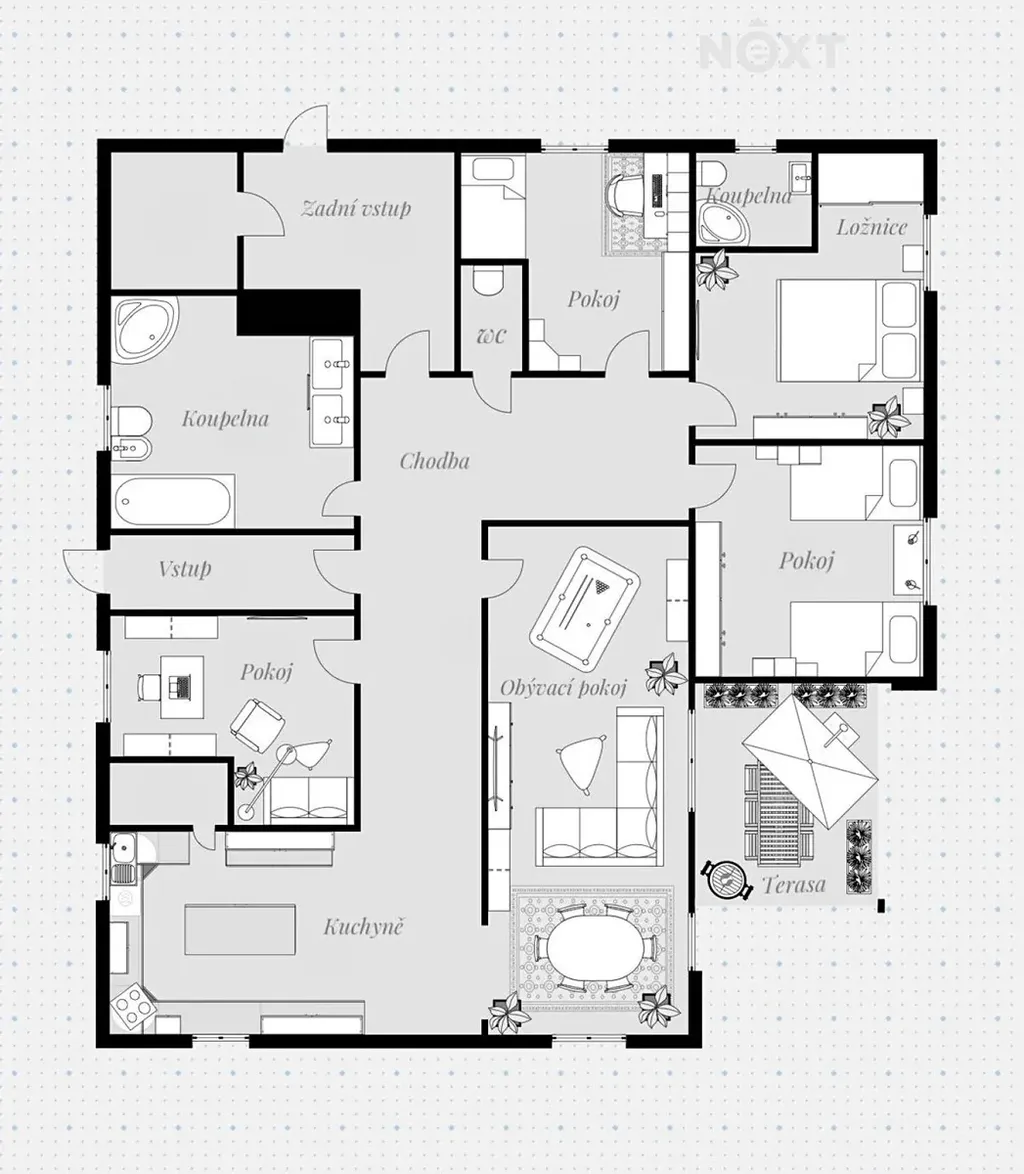 Na udržovaném pozemku se nachází bazén ideální pro letní osvěžení a také okrasné jezírko, které podtrhuje příjemnou atmosféru zahrady. Terasa navazující na obývací pokoj slouží jako ideální místo pro relaxaci, posezení s rodinou či přáteli.