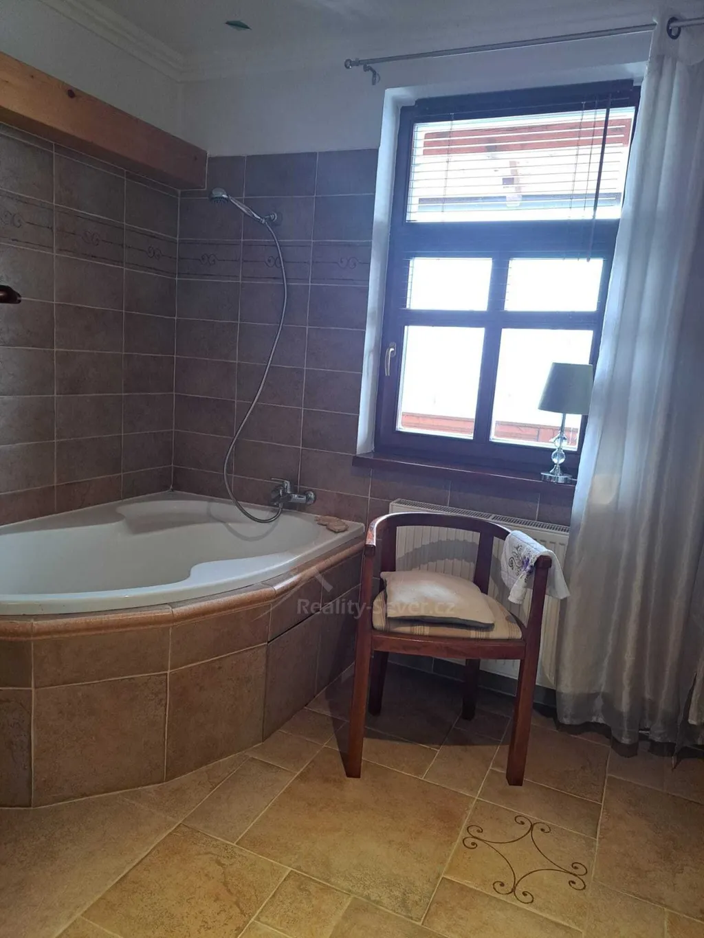 Přes zádveří vejdete do chodby s WC, vstupem do sklepa. Dále je pak kuchyně s východem na zahradu, jídelna, obývák s výklenkem a kachlovými krbovými kamny s výměníkem na vodu. Přikládání do kamen je řešeno z chodby, takže obývák zůstává čistý a bez zápachu. V tomto podlaží je v kuchyni podlahové topení napojené na ústřední plynové topení a na WC je podlahové topení elektrické. V jídelně je původní borovicová podlaha a v obýváku původní dubová parketová podlaha. Obě ve výborném stavu.