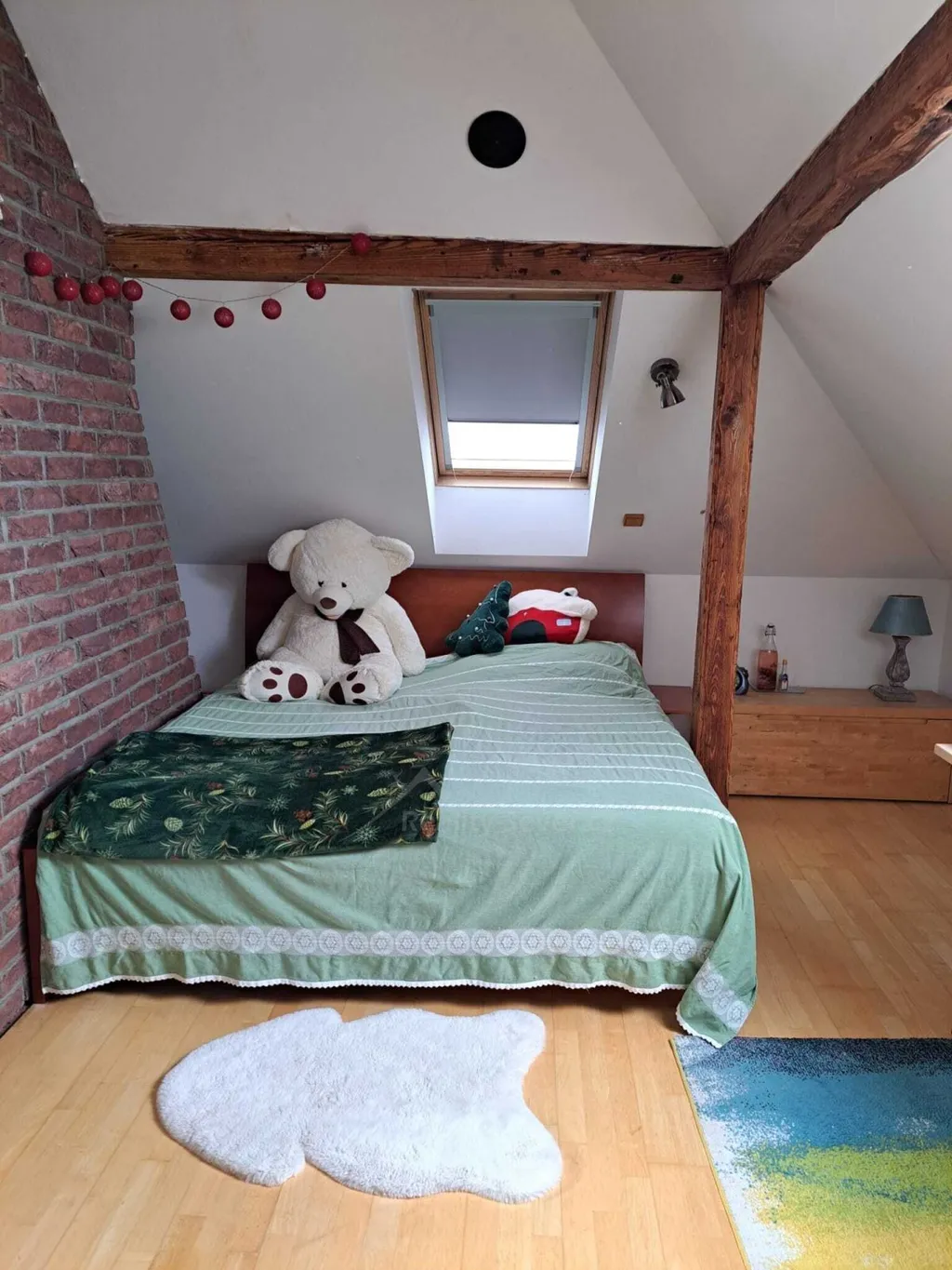 Podkroví je obytné se třemi střešními okny a je zatepleno vatou 16 cm. Jsou zde krbová kamna JOTUL, zavedeno ústřední topení, podlaha plovoucí dýha buk.
