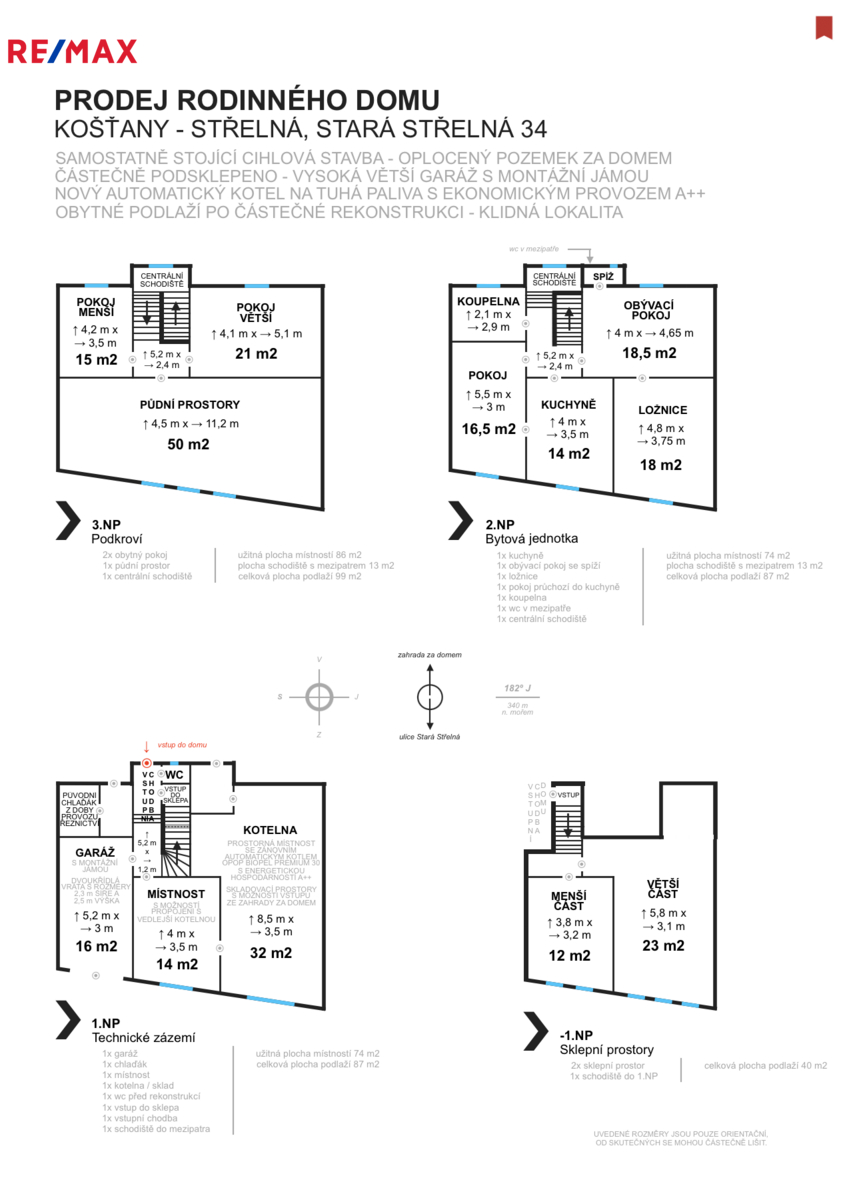 - 3. podlaží: dva samostatné pokoje s radiátory + půdní prostor