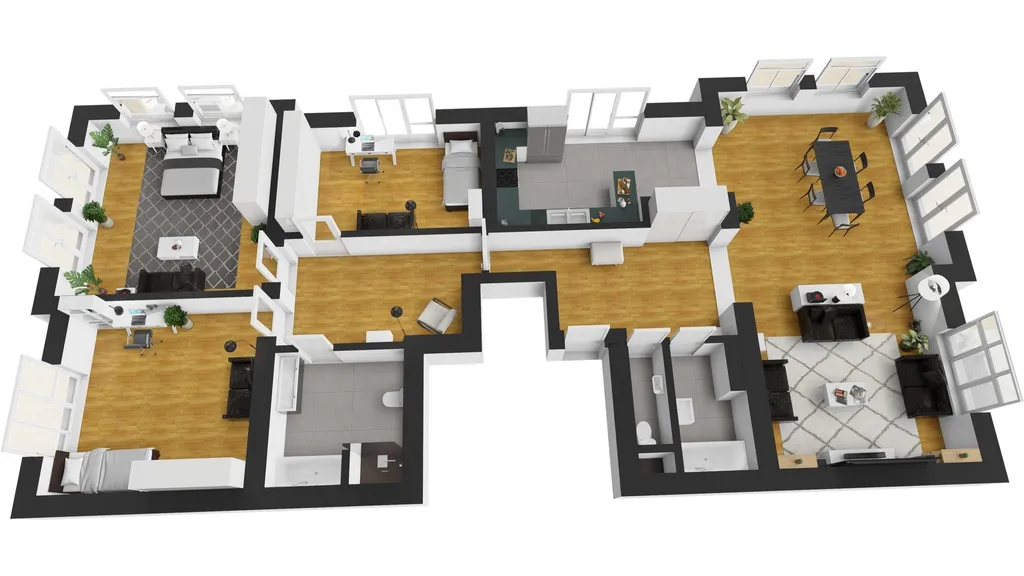 Byt je velmi světlý a pronájímá se vkusně a moderně zařízený. Místnosti jsou znázorněné v půdorysu a veškerý nábytek je vyrobený na míru. Nachází se zde obývací pokoj s jídelnou a kuchyňským koutem s veškerými spotřebiči Miele a Bosch. Dále jsou zde tři prostorné ložnice, chodba a hala s vestavěnou skříní, koupelna s vanou a toaletou, koupelna se sprchou, samostatná toaleta s umyvadlem.