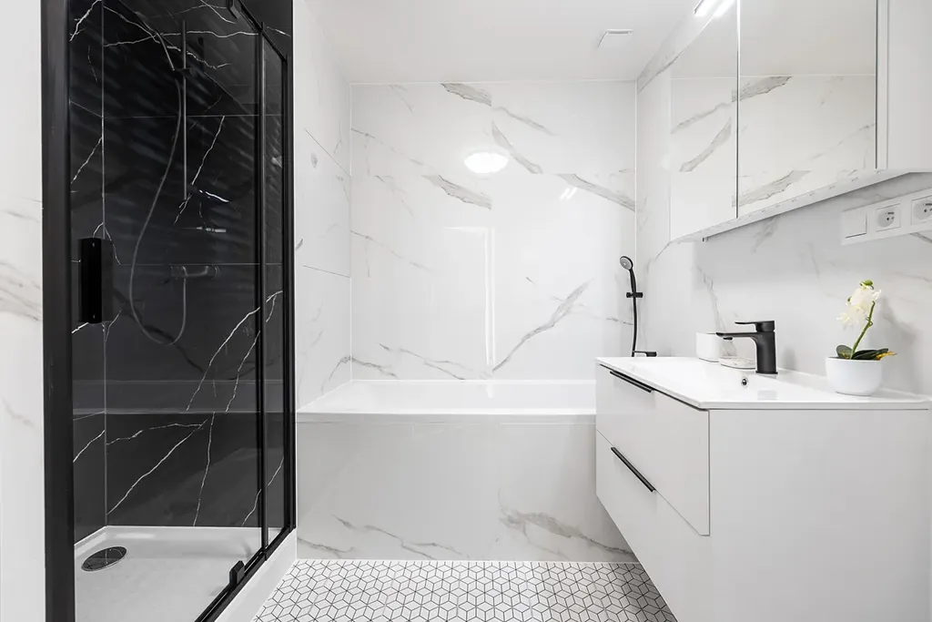 - nová sanita (vana, sprchový kout, umyvadlo, skříňka, toaleta)